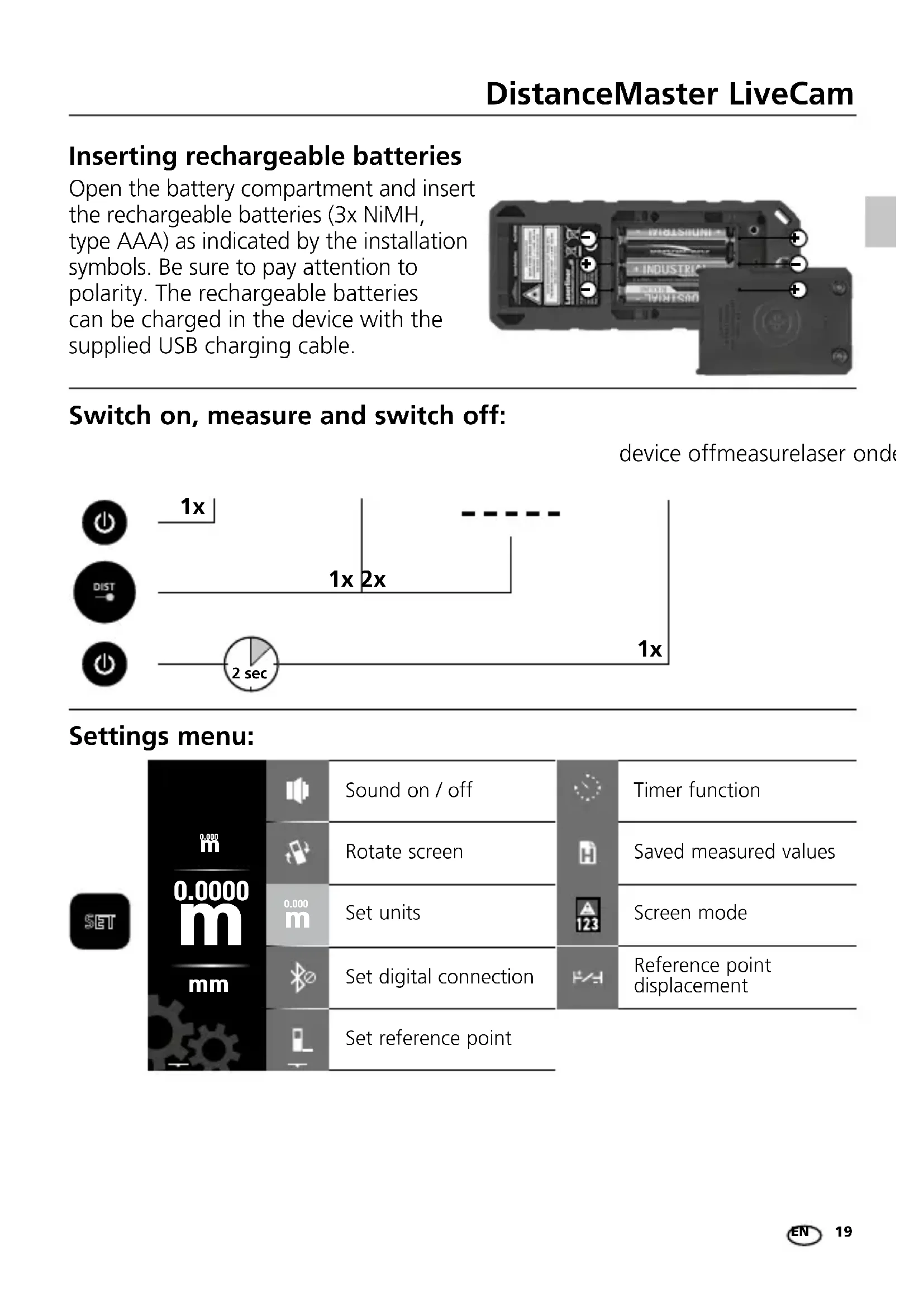 Settings menu: Rotate screen Set units Set digital connection Set reference point Sound on / off Screen mode Timer function Saved measured values Reference point displacement Switch on, measure and switch off: Inserting rechargeable batteries Open the battery compartment and insert the rechargeable batteries (3x NiMH, type AAA) as indicated by the installation symbols. Be sure to pay attention to polarity. The rechargeable batteries can be charged in the device with the supplied USB charging cable. EN20 1x 1x