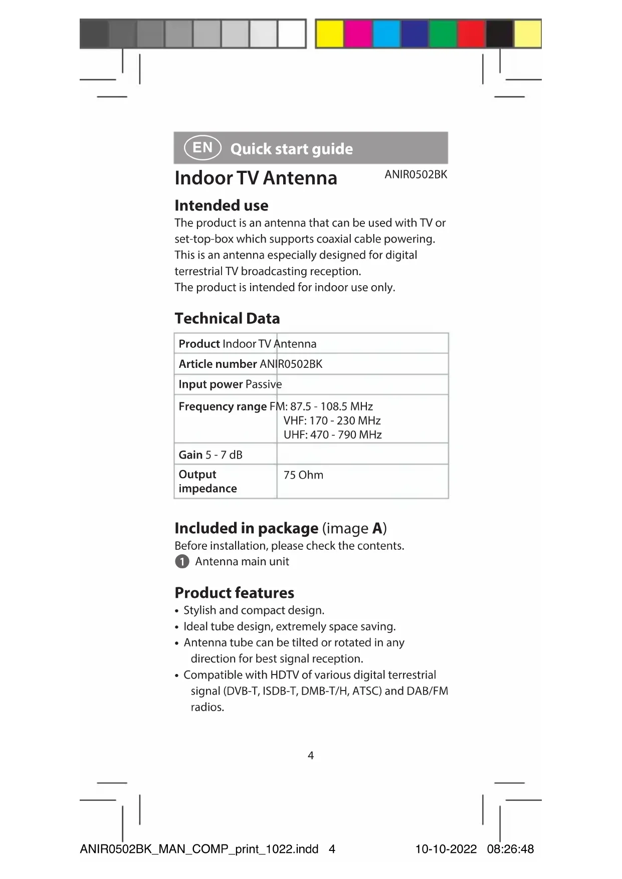 After the installation is nished, you can use your set-top-box to check the signal strength and quality. If you cannot have a steady picture, please move the antenna to a better reception position. When you nd the best position, please x it. ANIR0502BK_MAN_COMP_print_1022.indd 6ANIR0502BK_MAN_COMP_print_1022.indd 6 10-10-2022 08:26:5010-10-2022 08:26:507 Disposal This symbol indicates that this product should not be thrown away with other household waste throughout the EU. To prevent possible harm to the environment or human health by uncontrolled waste disposal, you are responsible for recycling it so that it can promote the sustainable reuse of raw materials. To return your used product, you can use the regular return and collection systems or contact the store where the product was purchased. They can recycle this product for the environment.