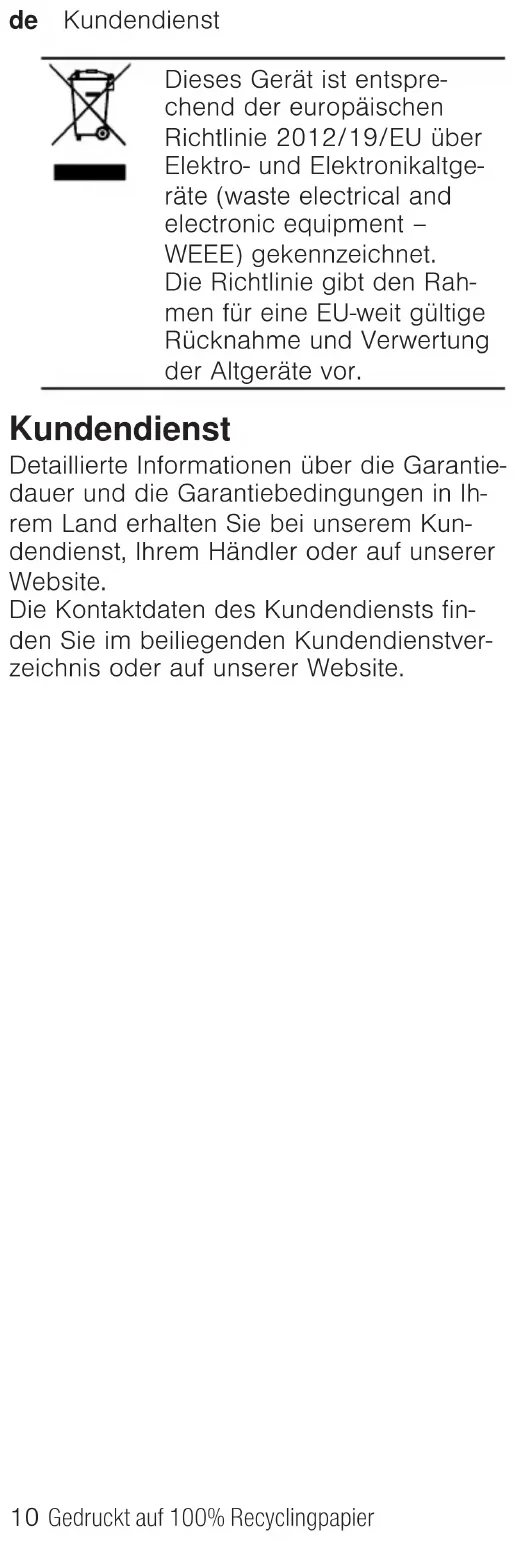 Troubleshooting Appliance switches off during processing (800W – 1200W models only). The overload protection feature has been activated. ▶ Remove the mains plug and leave the appliance to cool down for approx. 1hour to deactivate the overload pro- tection device. Note:If the fault cannot be eliminated, please contact customer service. Disposing of old appliance ▶ Dispose of the appliance in an environ- mentally friendly manner. Information about current disposal meth- ods are available from your specialist dealer or local authority. This appliance is labelled in accordance with European Directive 2012/19/EU con- cerning used electrical and electronic appliances (waste electrical and electronic equipment - WEEE). The guideline determines the framework for the return and recycling of used appli- ances as applicable throughout the EU. Customer Service Detailed information on the warranty period and terms of warranty in your country is available from our after-sales service, your retailer or on our website.en Customer Service 14 Printed on 100% recycled paper The contact details for Customer Service can be found in the enclosed Customer Service directory or on our website.Sécurité fr