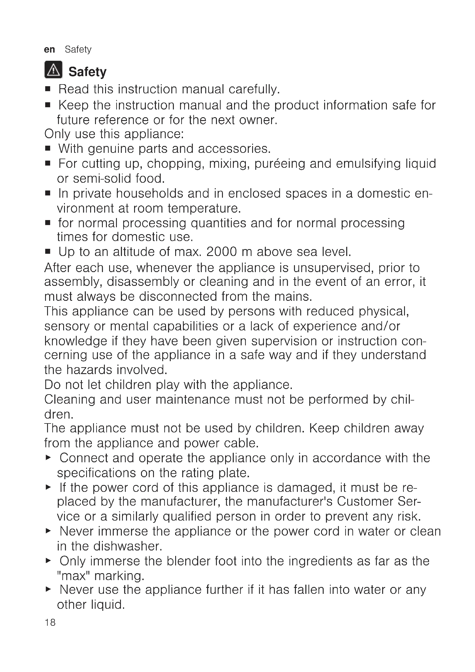 Safety ¡ Read this instruction manual carefully. ¡ Keep the instruction manual and the product information safe for future reference or for the next owner. Only use this appliance: ¡ With genuine parts and accessories. ¡ For cutting up, chopping, mixing, puréeing and emulsifying liquid or semi-solid food. ¡ In private households and in enclosed spaces in a domestic en- vironment at room temperature. ¡ for normal processing quantities and for normal processing times for domestic use. ¡ Up to an altitude of max. 2000m above sea level. After each use, whenever the appliance is unsupervised, prior to assembly, disassembly or cleaning and in the event of an error, it must always be disconnected from the mains. This appliance can be used by persons with reduced physical, sensory or mental capabilities or a lack of experience and/or knowledge if they have been given supervision or instruction con- cerning use of the appliance in a safe way and if they understand the hazards involved. Do not let children play with the appliance. Cleaning and user maintenance must not be performed by chil- dren. The appliance must not be used by children. Keep children away from the appliance and power cable. ▶ Connect and operate the appliance only in accordance with the specifications on the rating plate. ▶ If the power cord of this appliance is damaged, it must be re- placed by the manufacturer, the manufacturer's Customer Ser- vice or a similarly qualified person in order to prevent any risk. ▶ Never immerse the appliance or the power cord in water or clean in the dishwasher. ▶ Only immerse the blender foot into the ingredients as far as the "max" marking. ▶ Never use the appliance further if it has fallen into water or any other liquid.Avoiding material damage en