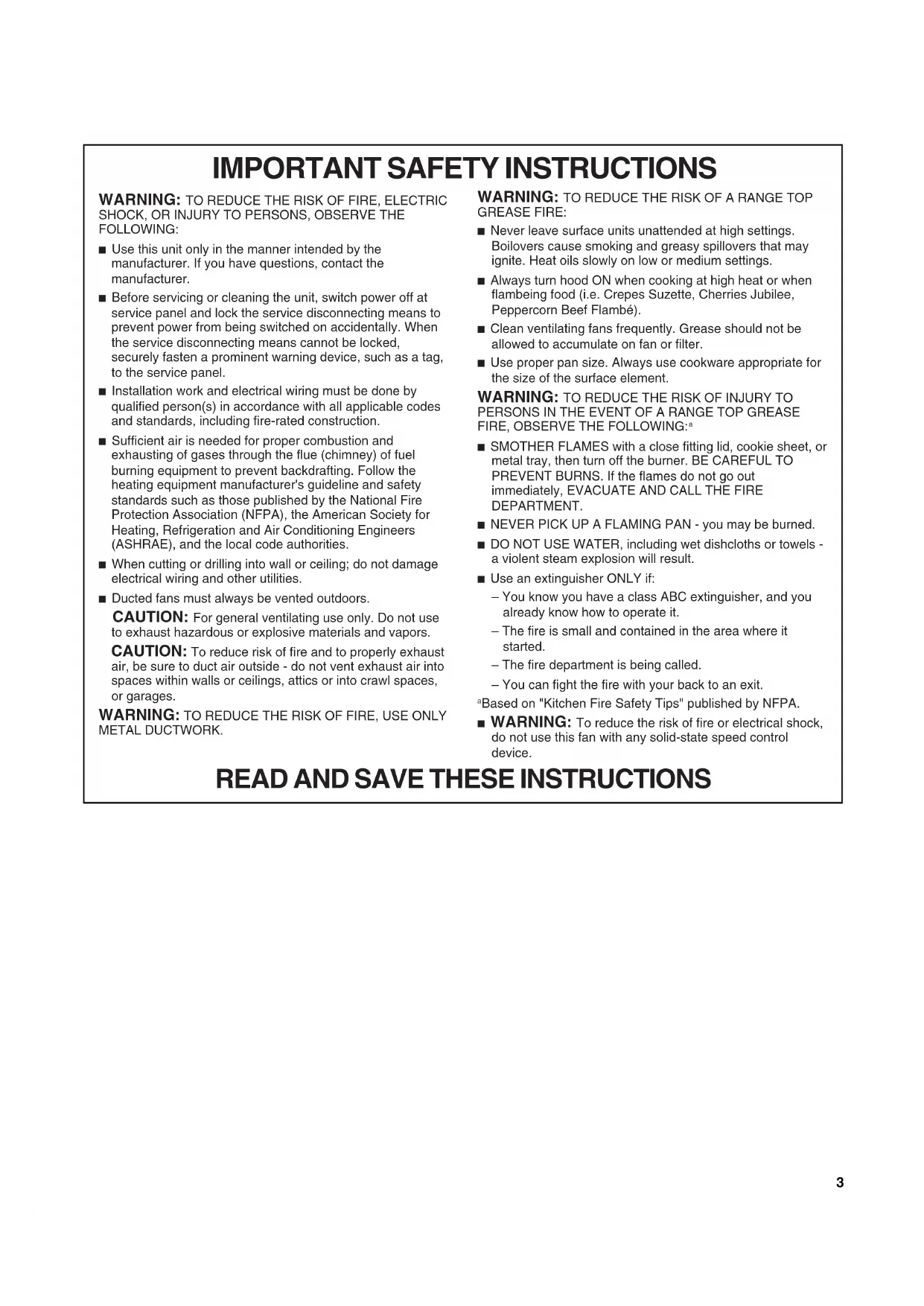 SHOCK, OR INJURY TO PERSONS, OBSERVE THE FOLLOWING: ■ Use this unit only in the manner intended by the manufacturer. If you have questions, contact the manufacturer. ■ Before servicing or cleaning the unit, switch power off at service panel and lock the service disconnecting means to prevent power from being switched on accidentally. When the service disconnecting means cannot be locked, securely fasten a prominent warning device, such as a tag, to the service panel. ■ Installation work and electrical wiring must be done by qualified person(s) in accordance with all applicable codes and standards, including fire-rated construction. ■ Sufficient air is needed for proper combustion and exhausting of gases through the flue (chimney) of fuel burning equipment to prevent backdrafting. Follow the heating equipment manufacturer's guideline and safety standards such as those published by the National Fire Protection Association (NFPA), the American Society for Heating, Refrigeration and Air Conditioning Engineers (ASHRAE), and the local code authorities. ■ When cutting or drilling into wall or ceiling; do not damage electrical wiring and other utilities. ■ Ducted fans must always be vented outdoors. CAUTION: For general ventilating use only. Do not use to exhaust hazardous or explosive materials and vapors. CAUTION: To reduce risk of fire and to properly exhaust air, be sure to duct air outside - do not vent exhaust air into spaces within walls or ceilings, attics or into crawl spaces, or garages.