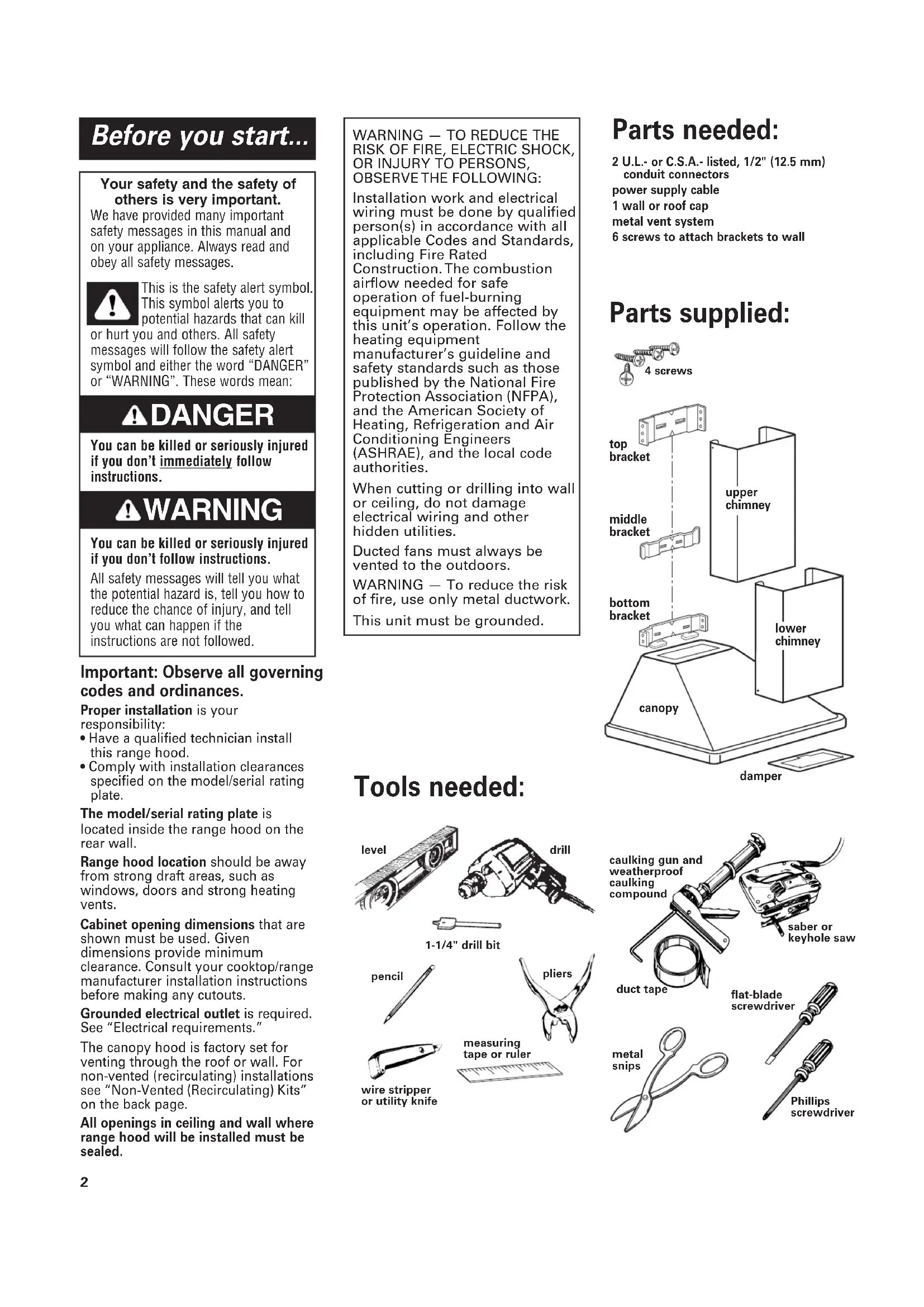 - Comply with installation clearances specified on the model/serial rating plate. The model/serial rating plate is located inside the range hood on the rear wall. Range hood location should be away from strong draft areas, such as windows, doors and strong heating vents. Cabinet opening dimensions that are shown must be used. Given dimensions provide minimum clearance. Consult your cooktop/range manufacturer installation instructions before making any cutouts. Grounded electrical outlet is required. See “Electrical requirements.” The canopy hood is factory set for venting through the roof or wall. For non-vented (recirculating) installations see “Non-Vented (Recirculating) Kits” on the back page. All openings in ceiling and wall where range hood will be installed must be sealed. Important: Observe all governing codes and ordinances. Parts supplied: 4 screws top bracketmiddlebracketbottombracketupperchimney canopydamperlowerchimney Parts needed: 2 U.L.- or C.S.A.- listed, 1/2" (12.5 mm) conduit connectorspower supply cable1 wall or roof capmetal vent system6 screws to attach brackets to wall Tools needed: Phillipsscrewdriverflat-bladescrewdrivercaulking gun andweatherproofcaulking compoundduct tapemetalsnipsplierspencilsaber orkeyhole sawdrill1-1/4" drill bitlevelmeasuringtape or rulerwire stripperor utility knife