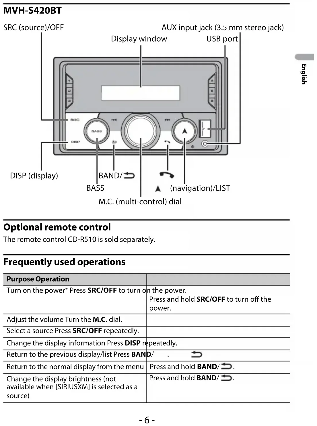 SRC (source)/OFF Display window M.C. (multi-control) dial BAND/ DISP (display) (navigation)/LIST USB port AUX input jack (3.5 mm stereo jack) BASS- 6 - English MVH-S420BT Optional remote control The remote control CD-R510 is sold separately. Frequently used operations Purpose Operation Turn on the power* Press SRC/OFF to turn on the power. Press and hold SRC/OFF to turn off the power. Adjust the volume Turn the M.C. dial. Select a source Press SRC/OFF repeatedly. Change the display information Press DISP repeatedly. Return to the previous display/list Press BAND/. Return to the normal display from the menu Press and hold BAND/. Change the display brightness (not available when [SIRIUSXM] is selected as a source) Press and hold BAND/. SRC (source)/OFF Display window M.C. (multi-control) dial BAND/ DISP (display) (navigation)/LIST USB port AUX input jack (3.5 mm stereo jack) BASS- 7 -- 7 - English
