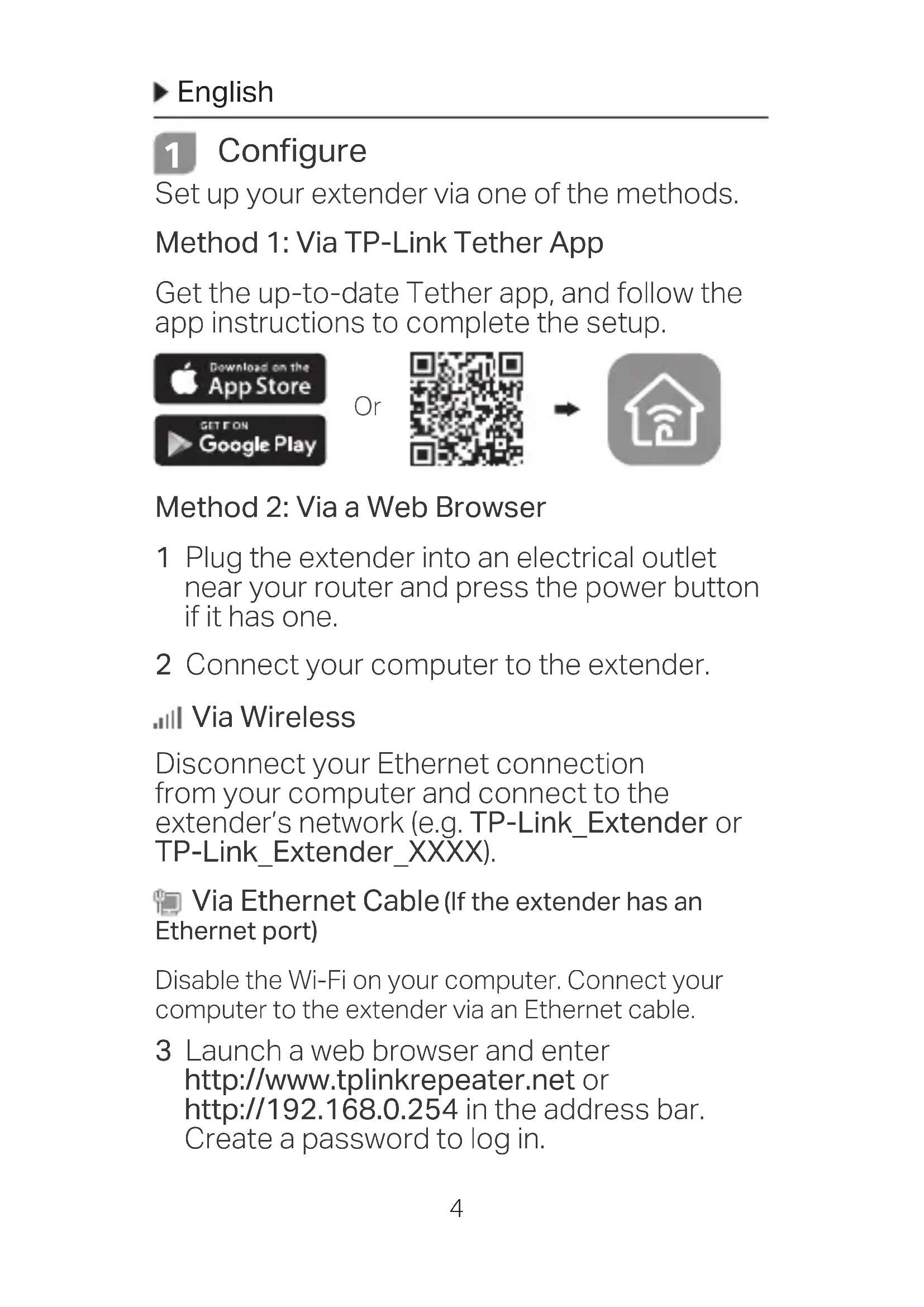 Configure Set up your extender via one of the methods. Method 1: Via TP-Link Tether App Get the up-to-date Tether app, and follow the app instructions to complete the setup. Method 2: Via a Web Browser 1 Plug the extender into an electrical outlet near your router and press the power button if it has one. 2 Connect your computer to the extender. Via Wireless Disconnect your Ethernet connection from your computer and connect to the extender’s network (e.g. TP-Link_Extender or TP-Link_Extender_XXXX). Via Ethernet Cable (If the extender has an Ethernet port) Disable the Wi-Fi on your computer. Connect your computer to the extender via an Ethernet cable. 3 Launch a web browser and enter http://www.tplinkrepeater.net or http://192.168.0.254 in the address bar. Create a password to log in. OrEnglish
