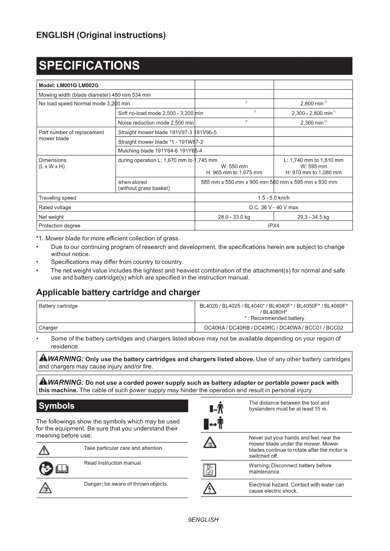 this machine. The cable of such power supply may hinder the operation and result in personal injury. Symbols The followings show the symbols which may be used for the equipment. Be sure that you understand their meaning before use. Take particular care and attention. Read instruction manual. Danger; be aware of thrown objects. The distance between the tool and bystanders must be at least 15 m. Never put your hands and feet near the mower blade under the mower. Mower blades continue to rotate after the motor is switched o. Warning; Disconnect battery before maintenance. Electrical hazard. Contact with water can cause electric shock.10 ENGLISH Do not pour water. Ni-MH Li-ion Only for EU countries Due to the presence of hazardous com- ponents in the equipment, waste electrical and electronic equipment, accumulators and batteries may have a negative impact on the environment and human health. Do not dispose of electrical and electronic appliances or batteries with household waste! In accordance with the European Directive on waste electrical and electronic equip- ment and on accumulators and batteries and waste accumulators and batteries, as well as their adaptation to national law, waste electrical equipment, batteries and accumulators should be stored separately and delivered to a separate collection point for municipal waste, operating in accor- dance with the regulations on environmen- tal protection. This is indicated by the symbol of the crossed-out wheeled bin placed on the equipment. Guaranteed sound power level according to EU Outdoor Noise Directive. Sound power level according to Australia NSW Noise Control Regulation. Intended use The machine is intended for lawn mowing. Noise The typical A-weighted noise level determined accord- ing to EN62841-4-3: Model LM001G Measured sound power level (L