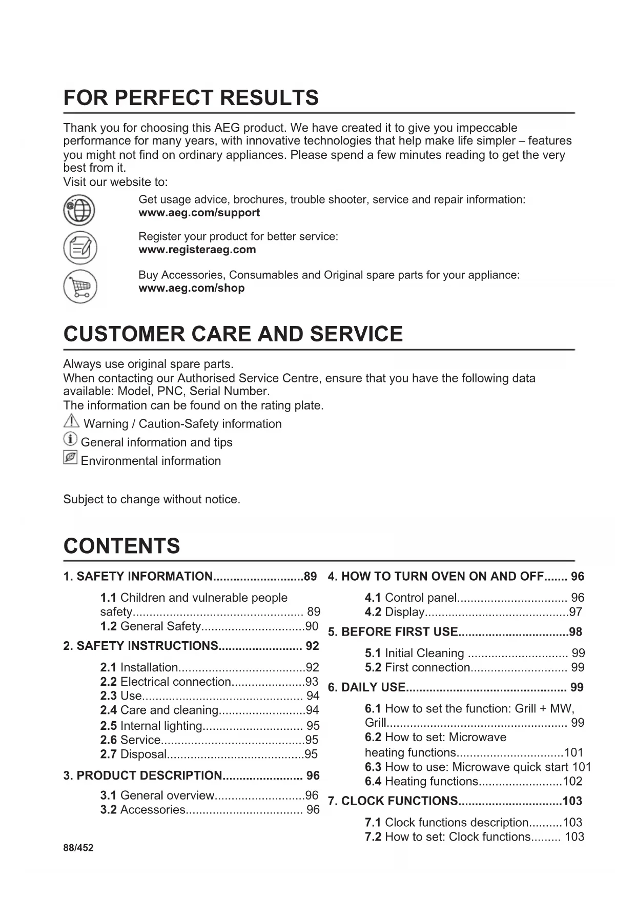 Always use original spare parts. When contacting our Authorised Service Centre, ensure that you have the following data available: Model, PNC, Serial Number. The information can be found on the rating plate. Warning / Caution-Safety information General information and tips Environmental information Subject to change without notice. CONTENTS