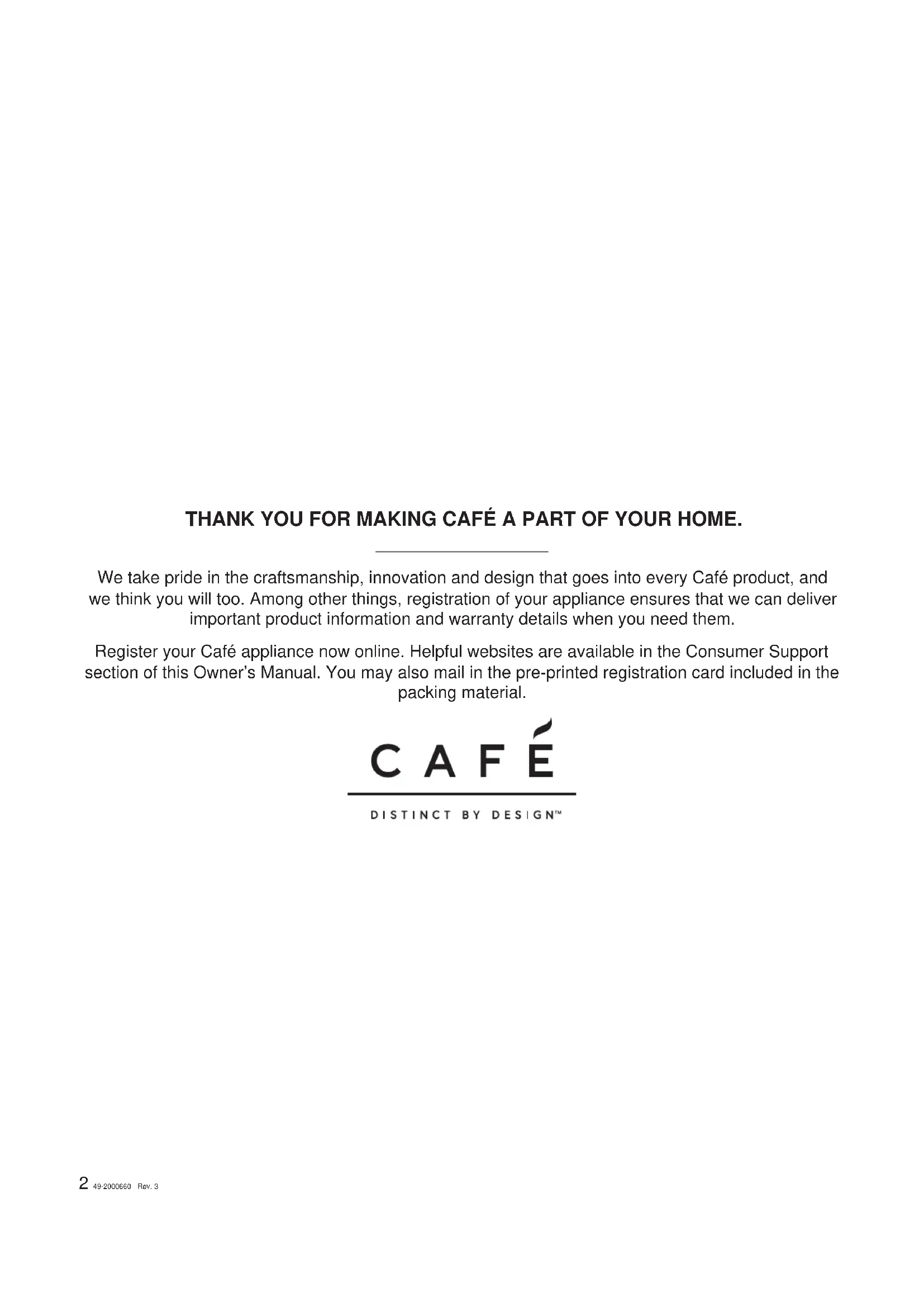 - Consumer Support 49-2000660 Rev. 3 THANK YOU FOR MAKING CAFÉ A PART OF YOUR HOME. We take pride in the craftsmanship, innovation and design that goes into every Café product, and we think you will too. Among other things, registration of your appliance ensures that we can deliver important product information and warranty details when you need them. Register your Café appliance now online. Helpful websites are available in the Consumer Support section of this Owner’s Manual. You may also mail in the pre-printed registration card included in the packing material.49-2000660 Rev. 3 3 p. 442