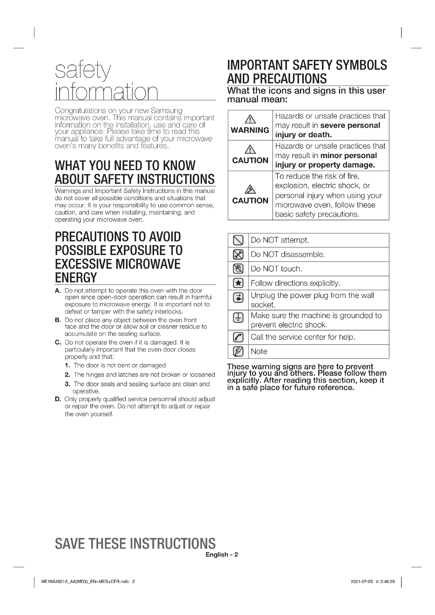 ME16A4021A_AA(MD3)_EN+MES+CFR.indb 2ME16A4021A_AA(MD3)_EN+MES+CFR.indb 2 2021-07-05 2:46:292021-07-05 2:46:29English - 3 IMPORTANT SAFETY INSTRUCTIONS When using any electrical appliance, basic safety precautions should be followed, including the following: WARNING WARNING To reduce risk of burns, electric shock, fire, personal injury or exposure to excessive microwave energy: