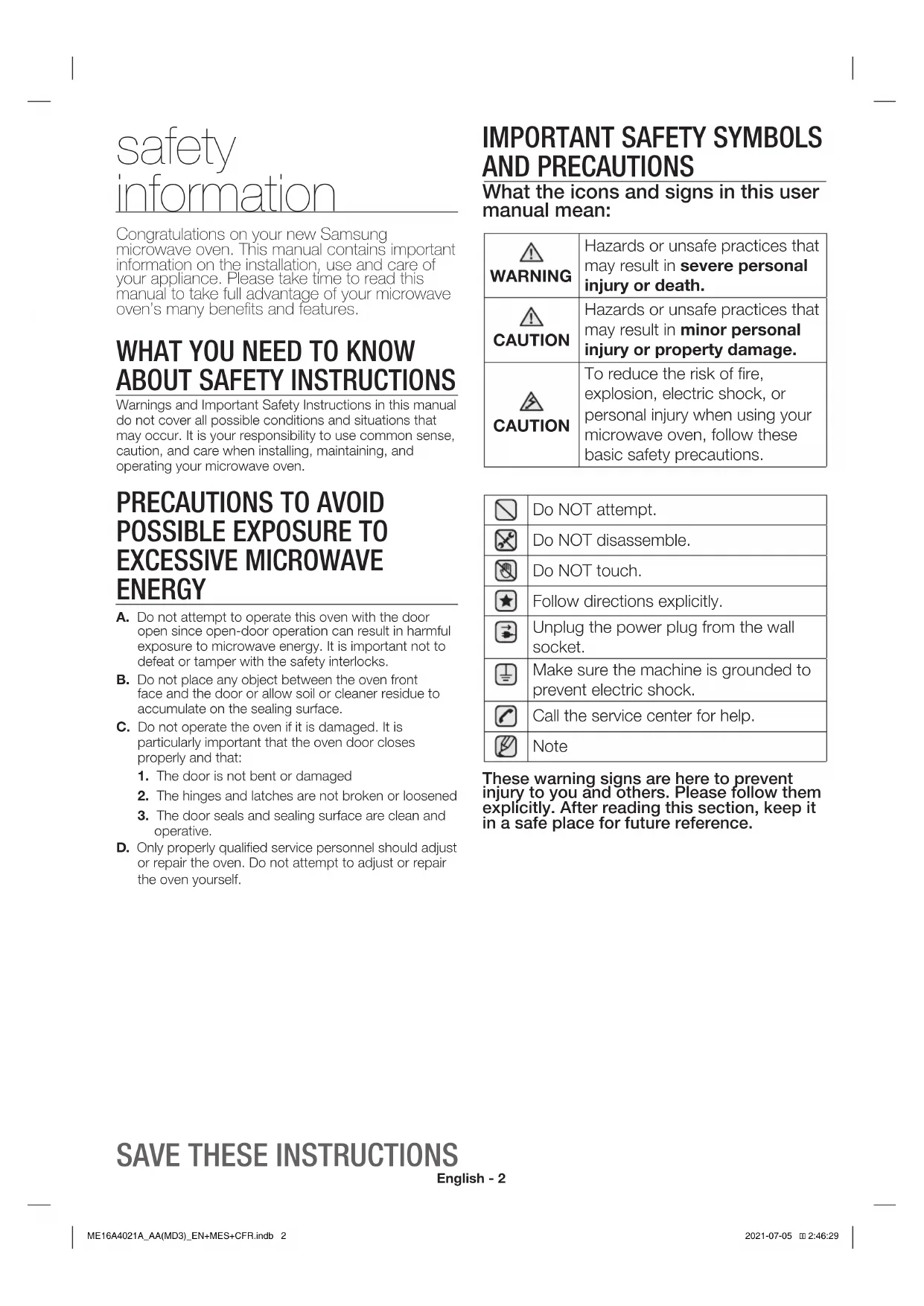 ME16A4021A_AA(MD3)_EN+MES+CFR.indb 2ME16A4021A_AA(MD3)_EN+MES+CFR.indb 2 2021-07-05 2:46:292021-07-05 2:46:29English - 3 IMPORTANT SAFETY INSTRUCTIONS When using any electrical appliance, basic safety precautions should be followed, including the following: WARNING WARNING To reduce risk of burns, electric shock, fire, personal injury or exposure to excessive microwave energy: