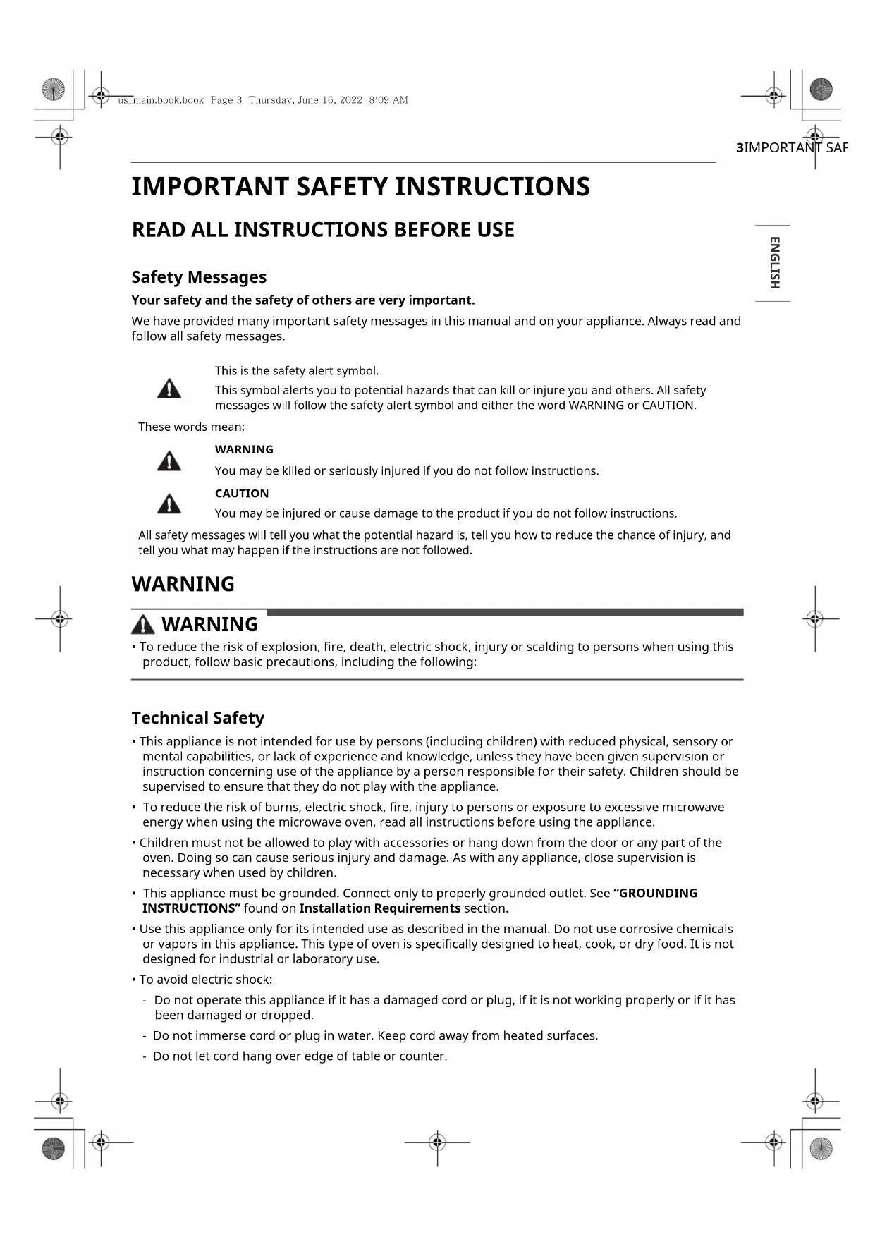 - Use this appliance only for its intended use as described in the manual. Do not use corrosive chemicals or vapors in this appliance. This type of oven is specifically designed to heat, cook, or dry food. It is not designed for industrial or laboratory use.• To avoid electric shock: - Do not operate this appliance if it has a damaged cord or plug, if it is not working properly or if it has been damaged or dropped.- Do not immerse cord or plug in water. Keep cord away from heated surfaces.- Do not let cord hang over edge of table or counter.This is the safety alert symbol.This symbol alerts you to potential hazards that can kill or injure you and others. All safety messages will follow the safety alert symbol and either the word WARNING or CAUTION. These words mean:WARNINGYou may be killed or seriously injured if you do not follow instructions.CAUTIONYou may be injured or cause damage to the product if you do not follow instructions.All safety messages will tell you what the potential hazard is, tell you how to reduce the chance of injury, and tell you what may happen if the instructions are not followed.us_main.book.book Page 3 Thursday, June 16, 2022 8:09 AM4 IMPORTANT SAFETY INSTRUCTIONS