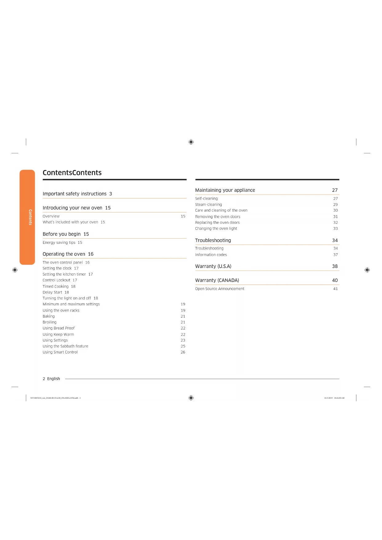Built-In Electric Wall Oven User manual NV51*5***S* NV51R5511S_AA_DG68-01125A-02_EN+MES+CFR.indb 1 11/5/2019 10:24:30 AM2 English Contents ContentsContents Important safety instructions 3 Introducing your new oven 15 Overview 15 What’s included with your oven 15 Before you begin 15 Energy saving tips 15 Operating the oven 16 The oven control panel 16 Setting the clock 17 Setting the kitchen timer 17 Control Lockout 17 Timed Cooking 18 Delay Start 18 Turning the light on and off 18 Minimum and maximum settings 19 Using the oven racks 19 Baking 21 Broiling 21 Using Bread Proof 22 Using Keep Warm 22 Using Settings 23 Using the Sabbath feature 25 Using Smart Control 26 Maintaining your appliance 27 Self-cleaning 27 Steam-cleaning 29 Care and cleaning of the oven 30 Removing the oven doors 31 Replacing the oven doors 32 Changing the oven light 33 Troubleshooting 34 Troubleshooting 34 Information codes 37 Warranty (U.S.A) 38 Warranty (CANADA) 40 Open Source Announcement 41 NV51R5511S_AA_DG68-01125A-02_EN+MES+CFR.indb 2 11/5/2019 10:24:30 AMEnglish 3 Important safety instructions