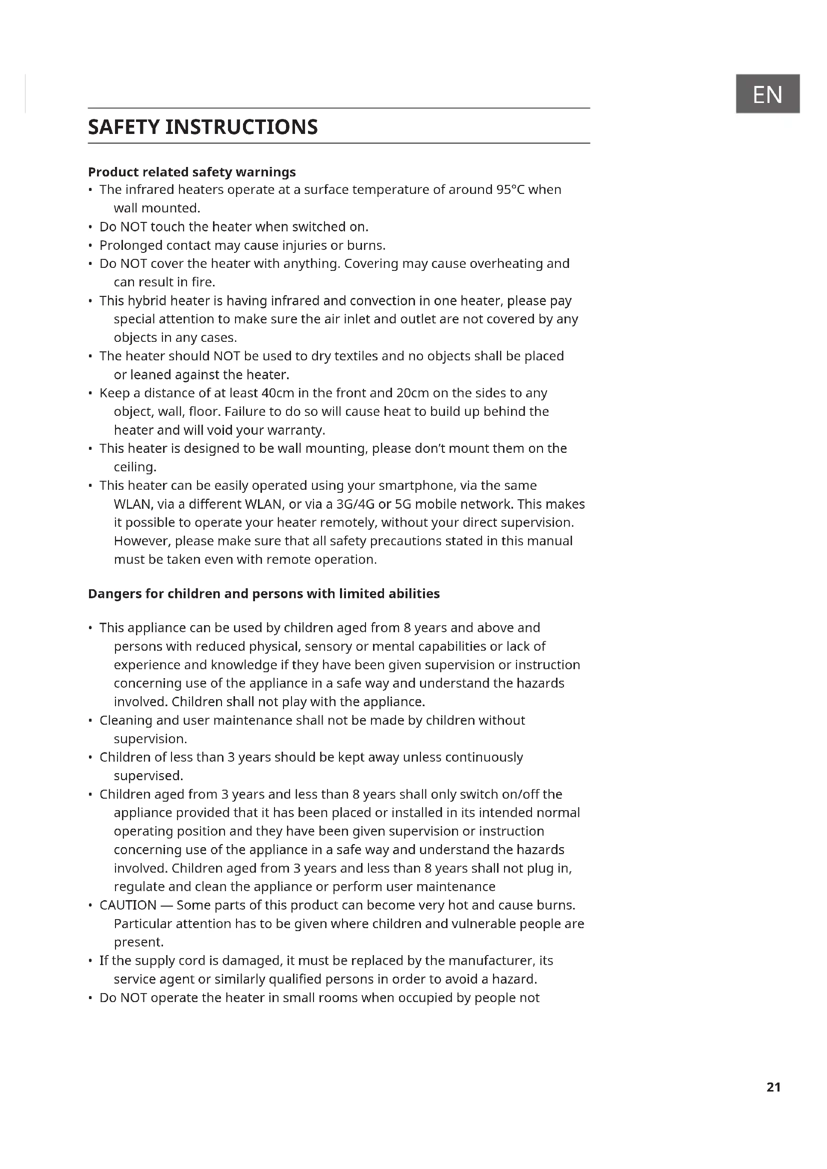 capable of leaving the room by themselves. The surface of the heater can reach a surface temperature of up to 95°C, keep out of reach of children and disabled persons.