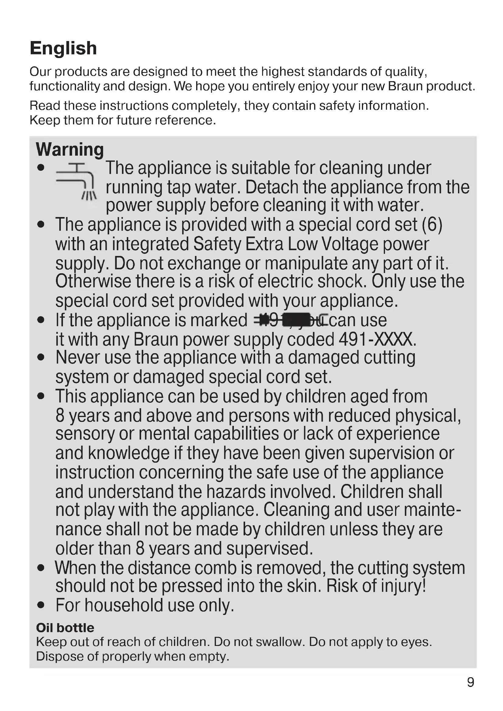 - Switch off the appliance and rinse the head and the trimmer under warm running water until all residues have been removed. You can also rinse the opened cutting system. Keeping your appliance in top shape To keep the cutting system working properly, oil it with light machine oil (D) after each use, especially when cleaning under running water. Preserving the batteries In order to maintain the optimum capacity of the rechargeable batteries, the appliance has to be fully discharged (by operating) every 6 months approximately. Then recharge the appliance to full capacity. Environmental notice Product contains batteries and/or recyclable electric waste. For environment protection do not dispose of in household waste, but for recycling take to electric waste collection points provided in your country. Subject to change without notice. For electric specifications, see printing on the special cord set.13 Guarantee We grant a 2 year guarantee on the product commencing on the date of purchase. Within the guarantee period we will eliminate any defects in the appliance resulting from faults in materials or workmanship, free of charge either by repairing or replacing the complete appliance at our discretion. This guarantee extends to every country where this appliance is supplied by Braun or its appointed distributor. This guarantee does not cover: damage due to improper use, normal wear or use as well as defects that have a negligible effect on the value or operation of the appliance. The guarantee becomes void if repairs are undertaken by unauthorised persons and if original Braun parts are not used. To obtain service within the guarantee period, hand in or send the complete appliance with your sales receipt to an authorised Braun Customer Service Centre (address information available online at www.service.braun.com). For UK only: This guarantee in no way affects your rights under statutory law. For Australia & New Zealand only: Warranty In Australia, our goods come with guarantees that cannot be excluded under the Australian Consumer Law. You are entitled to a replacement or refund for a major failure and for compensation for any other reasonably foreseeable loss or damage. You are also entitled to have the goods repaired or replaced if the goods fail to be of acceptable quality and the failure does not amount to a major failure. The benefi ts given by this warranty are in addition to other rights and remedies of the consumer law. For Claims in Australia please contact: Procter & Gamble Australia Pty Ltd 1 Innovation Road, Macquarie Park NSW 2113 Telephone: +612 8864 5000 Facsimile: +612 8864 5574 Email: gillette@au.pgconsumers.com14 For claims in New Zealand please contact: Procter & Gamble Distributing New Zealand Limited Unit 3, Building I, 5 Orbit Drive Rosedale, North Shore City 0632 Auckland, New Zealand Telephone: +649 477 6400 Facsimile: +649 477 6399 Email: gillette@nz.pgconsumers.com Our Warranty This appliance is also covered by a 24 Month Replacement Warranty commencing on the date of purchase (Our Warranty). Our Warranty applies in all States and Territories of Australia and in New Zealand and is in addition to any mandatory statutory obligations imposed on Procter & Gamble Australia Pty. Ltd., its distributors and its manufacturer. Our Warranty does not purport to exclude, restrict or modify any such mandatory statutory obligations. Our Warranty only covers defects in the appliance resulting from faults in workmanship or materials. Therefore, if your appliance becomes faulty as a result of faults in workmanship or materials, it will be exchanged by your retailer, on presentation of proof of purchase. Our Warranty only applies to domestic or household use of this appliance and the warranty will only apply if the correct operating instructions included with this product have been followed. For any appliance replaced under this warranty, Our Warranty ends on the expiry of the warranty period that applied to the original appliance. Our Warranty does not cover: A. Damage arising from improper use or operation on incorrect voltages. B. Breakages to shaver foils, glass jars, etc. C. Normal wear due to moving parts. D. Repairs undertaken by unauthorised service personnel or use of non genuine parts. E. Appliances that are outside the warranty period or are not faulty. This appliance is not intended for use by young children or infi rm persons without supervision. Young children should be supervised to ensure that they do not play with the appliance.15 If the appliance is powered by a cord extension set or electrical portable outlet device these should be positioned so they are not subject to splashing or ingress of moisture. To the extent permitted by the laws of the Commonwealth of Australia and New Zealand and applicable laws of a State or Territory of Australia, and without aff ecting any mandatory statutory obligations imposed by law, Our Warranty is given in exchange for any other rights you may have against Procter & Gamble Australia Pty. Ltd. or its distributors or manufacturer, whether at law, in tort (including negligence), in equity or under statute. Please retain proof of purchase of this appliance. If you have any questions in relation to Our Warranty, please call our Consumer Service line (see below for numbers). If you intend to make a claim please telephone our Customer Service line on the numbers set out below to obtain information about your claim and any costs associated with claiming under Our Warranty. You will bear the cost of returning your product to us. Repairs and service If you are sending your appliance for repair under Our Warranty, please pack the appliance adequately and send it to your nearest Service Agent, at your expense. For service or replacement parts refer to the authorised Service Agents listed overleaf. Local Service Agents may change from time to time – in that event please contact the Consumer Service free call number below for updated local ser