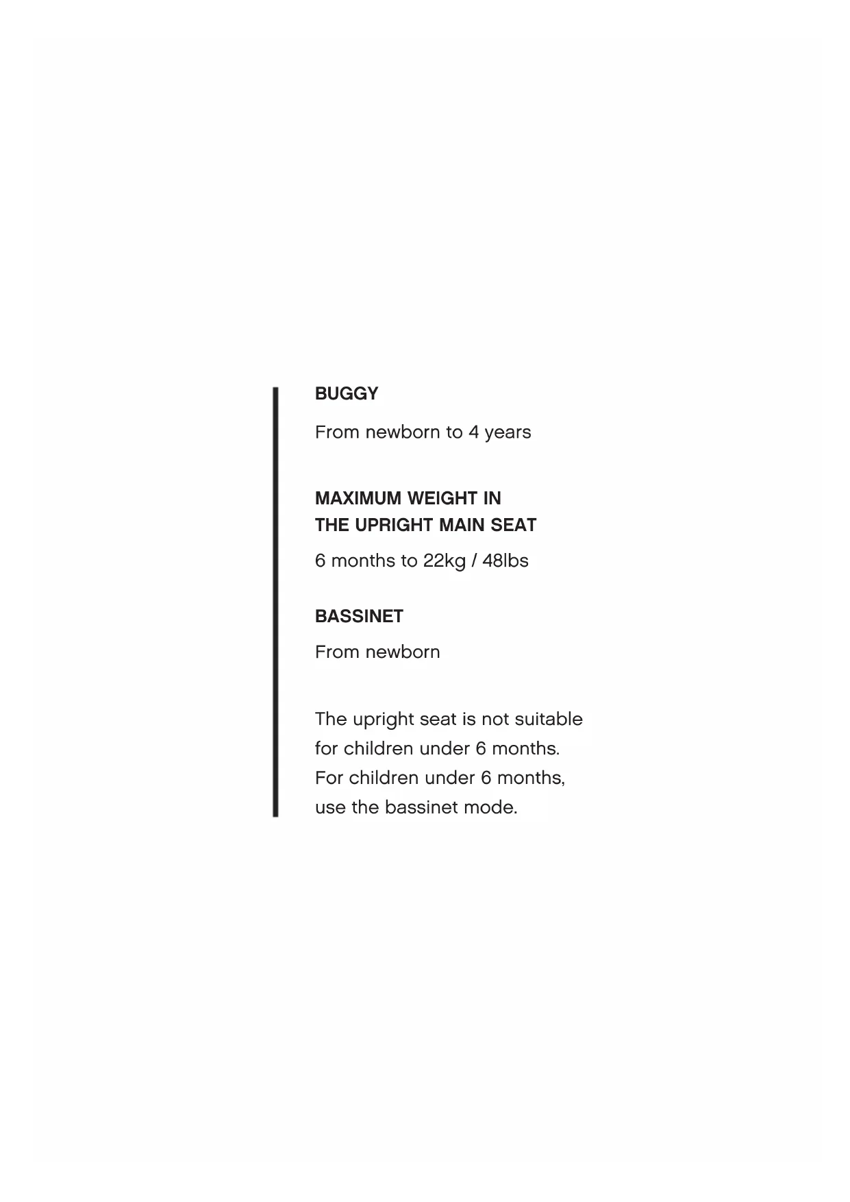 6 months to 22kg / 48lbs BASSINET From newborn The upright seat is not suitable for children under 6 months. For children under 6 months, use the bassinet mode.5 important information