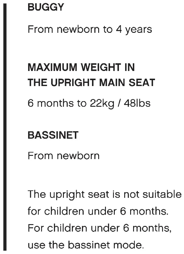 6 months to 22kg / 48lbs BASSINET From newborn The upright seat is not suitable for children under 6 months. For children under 6 months, use the bassinet mode.5 important information