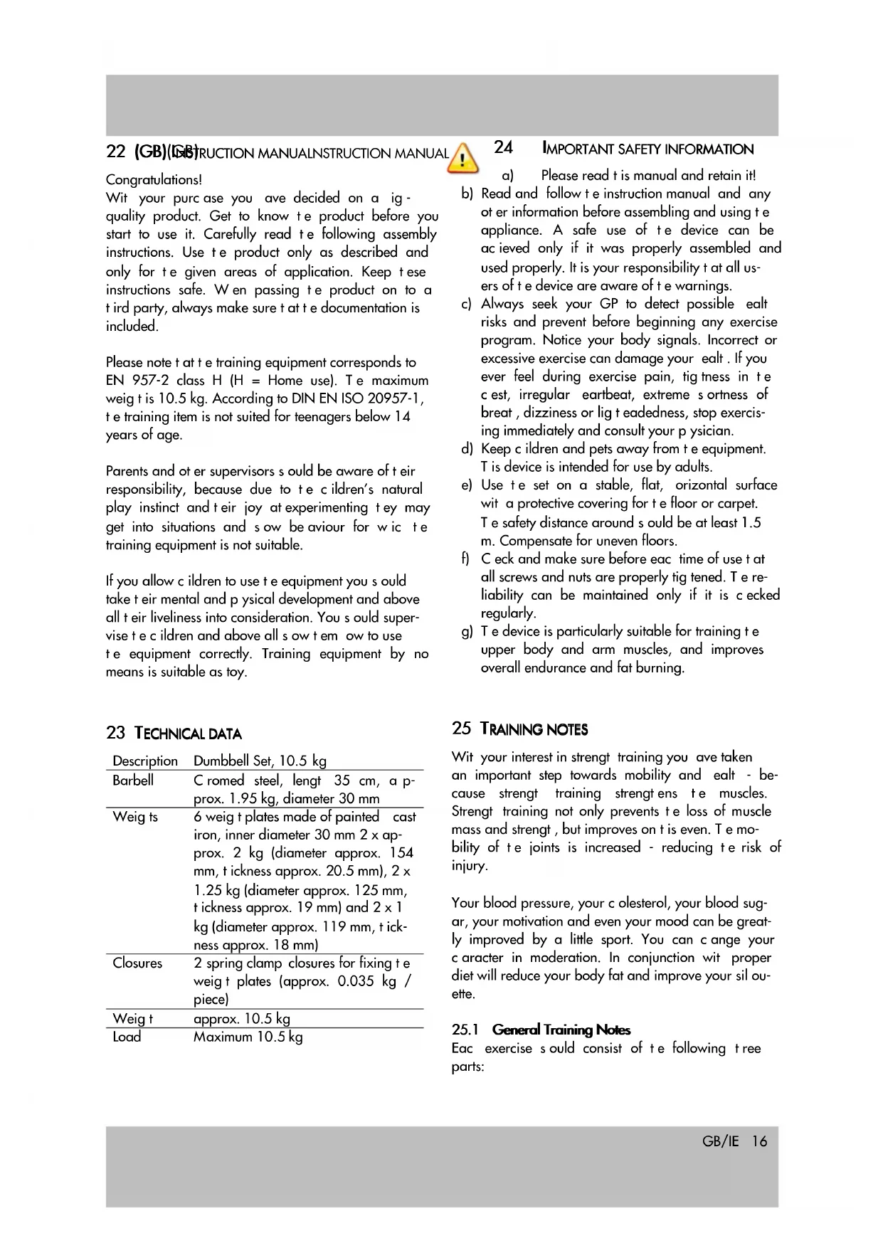 Congratulations! With your purchase you have decided on a high- quality product. Get to know the product before you start to use it. Carefully read the following assembly instructions. Use the product only as described and only for the given areas of application. Keep these instructions safe. When passing the product on to a third party, always make sure that the documentation is included. Please note that the training equipment corresponds to EN 957-2 class H (H = Home use). The maximum weight is 10.5 kg. According to DIN EN ISO 20957-1, the training item is not suited for teenagers below 14 years of age. Parents and other supervisors should be aware of their responsibility, because due to the childrenÊs natural play instinct and their joy at experimenting they may get into situations and show behaviour for which the training equipment is not suitable. If you allow children to use the equipment you should take their mental and physical development and above all their liveliness into consideration. You should super- vise the children and above all show them how to use the equipment correctly. Training equipment by no means is suitable as toy.