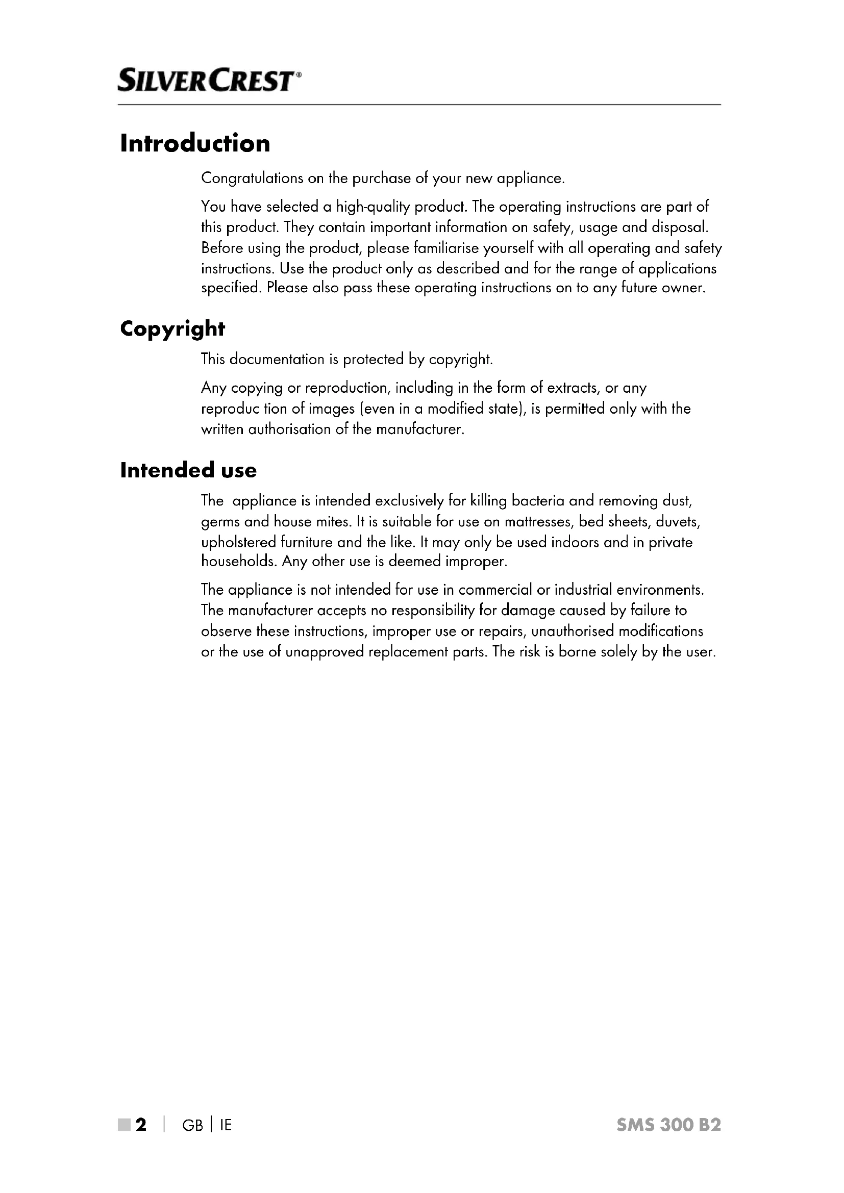 SMS 300 B2 Introduction Congratulations on the purchase of your new appliance. You have selected a high-quality product. The operating instructions are part of this product. They contain important information on safety, usage and disposal. Before using the product, please familiarise yourself with all operating and safety instructions. Use the product only as described and for the range of applications specified. Please also pass these operating instructions on to any future owner. Copyright This documentation is protected by copyright. Any copying or reproduction, including in the form of extracts, or any reproduc tion of images (even in a modified state), is permitted only with the written authorisation of the manufacturer. Intended use The appliance is intended exclusively for killing bacteria and removing dust, germs and house mites. It is suitable for use on mattresses, bed sheets, duvets, upholstered furniture and the like. It may only be used indoors and in private households. Any other use is deemed improper. The appliance is not intended for use in commercial or industrial environments. The manufacturer accepts no responsibility for damage caused by failure to observe these instructions, improper use or repairs, unauthorised modifications or the use of unapproved replacement parts. The risk is borne solely by the user.GB