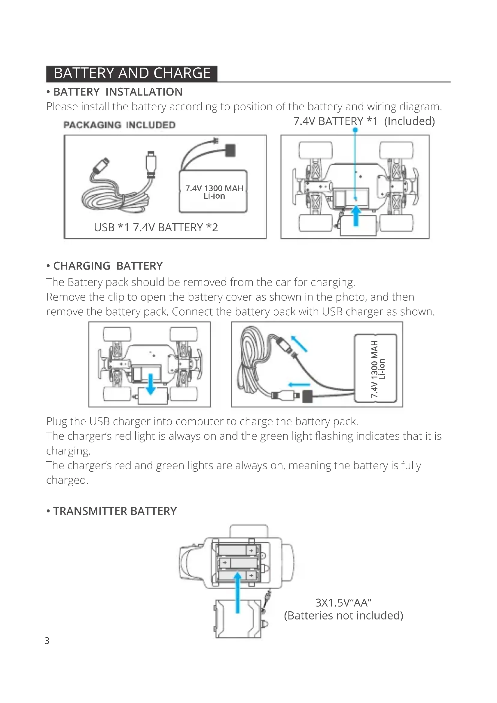 - TRANSMITTER BATTERY The Battery pack should be removed from the car for charging. Remove the clip to open the battery cover as shown in the photo, and then remove the battery pack. Connect the battery pack with USB charger as shown. Plug the USB charger into computer to charge the battery pack. The charger’s red light is always on and the green light flashing indicates that it is charging. The charger’s red and green lights are always on, meaning the battery is fully charged. 3X1.5V“AA” (Batteries not included) 7.4V 1300 MAH Li-ion