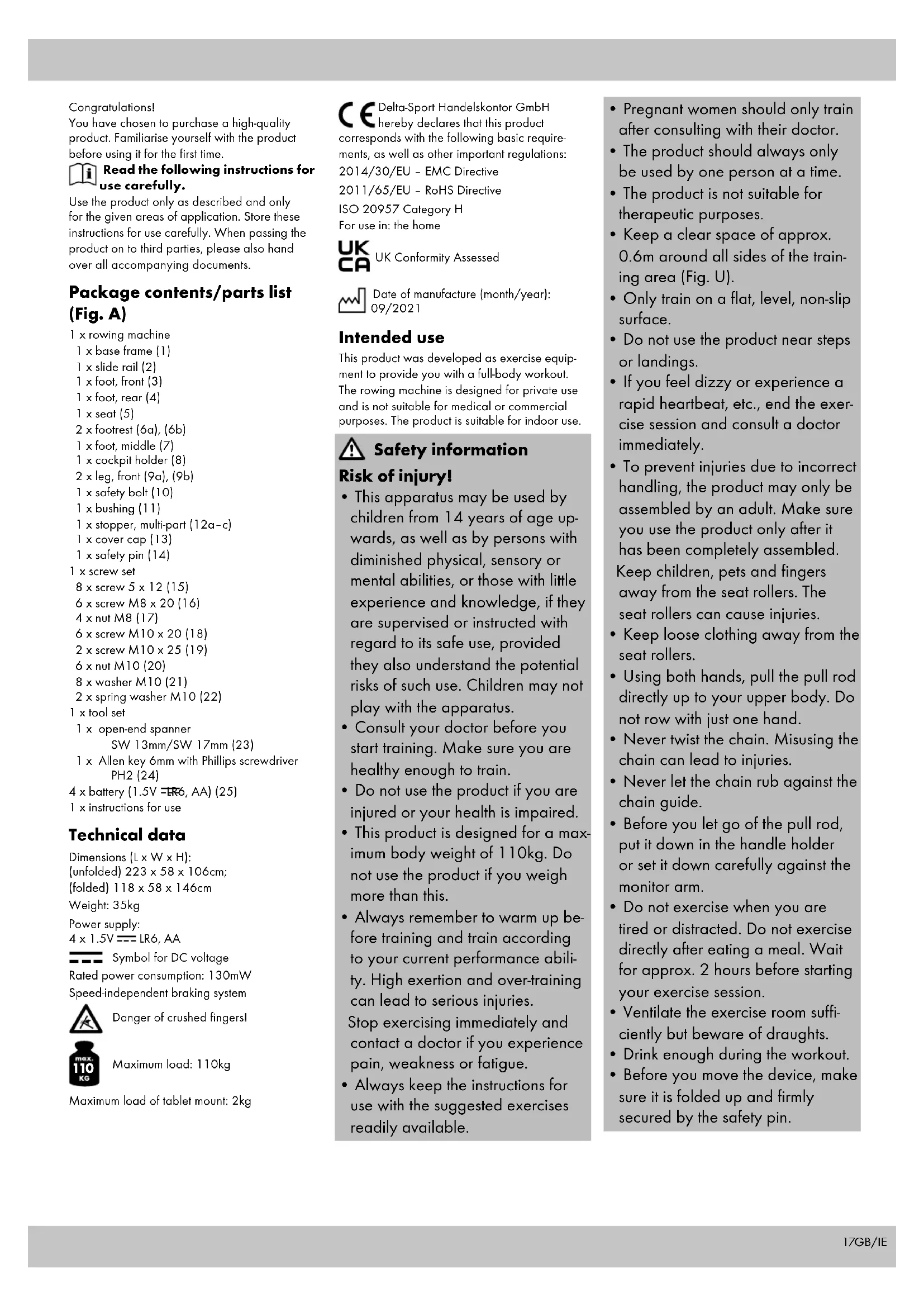 Maximum load: 110kg Maximum load of tablet mount: 2kg Delta-Sport Handelskontor GmbH hereby declares that this product corresponds with the following basic require- ments, as well as other important regulations: 2014/30/EU – EMC Directive 2011/65/EU – RoHS Directive ISO 20957 Category H For use in: the home UK Conformity Assessed Date of manufacture (month/year): 09/2021 Intended use This product was developed as exercise equip- ment to provide you with a full-body workout. The rowing machine is designed for private use and is not suitable for medical or commercial purposes. The product is suitable for indoor use. Safety information Risk of injury!