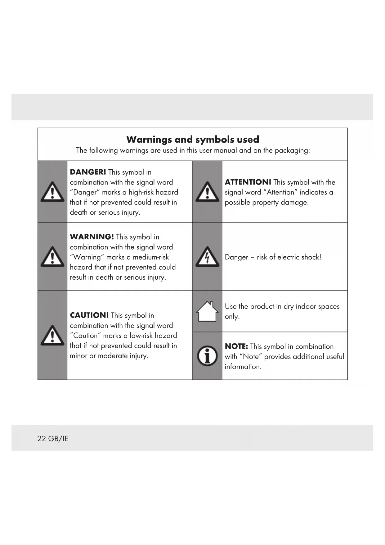 THE DOCUMENTS! In the case of damage resulting from non-compliance with these operating instructions the warranty claim becomes invalid! No liability is accepted for consequential damage! In the case of material damage or personal injury caused by incorrect handling or non- compliance with the safety instructions, no liability is accepted!26 GB/IE Children and persons with disabilities