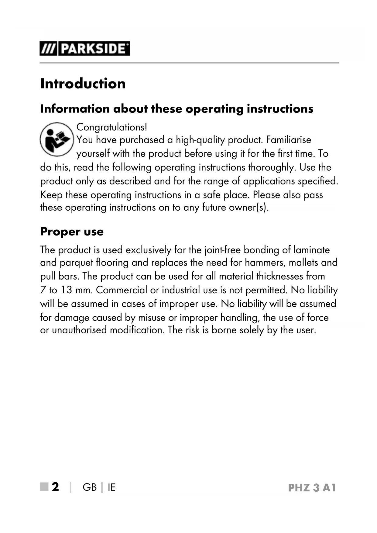 Introduction Information about these operating instructions Congratulations! You have purchased a high-quality product. Familiarise yourself with the product before using it for the first time. To do this, read the following operating instructions thoroughly. Use the product only as described and for the range of applications specified. Keep these operating instructions in a safe place. Please also pass these operating instructions on to any future owner(s). Proper use The product is used exclusively for the joint-free bonding of laminate and parquet flooring and replaces the need for hammers, mallets and pull bars. The product can be used for all material thicknesses from 7 to 13mm. Commercial or industrial use is not permitted. No liability will be assumed in cases of improper use. No liability will be assumed for damage caused by misuse or improper handling, the use of force or unauthorised modification. The risk is borne solely by the user. IB_380558_PHZ3A1_LB8.indb 2 01.04.2022 13:22:24PHZ 3 A1