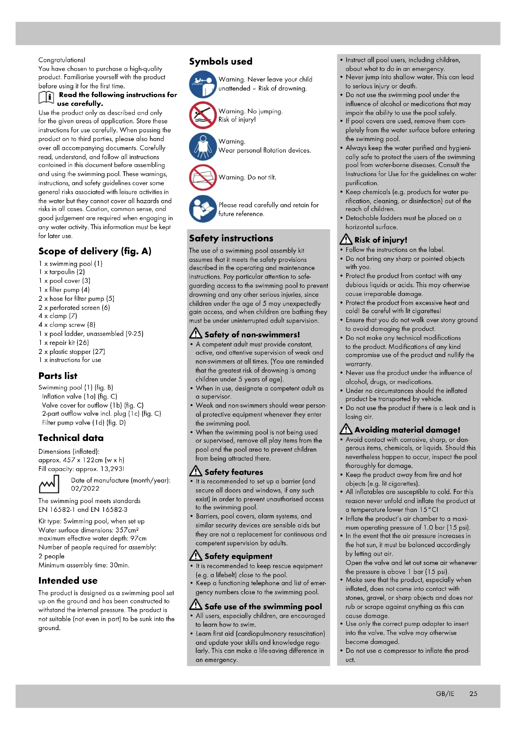 Download the instructions for your Inflatable pool in PDF format for free! Find your manual 53013A - CRIVIT and take your electronic device back in hand. On this page are published all the documents necessary for the use of your device. 53013A by CRIVIT.