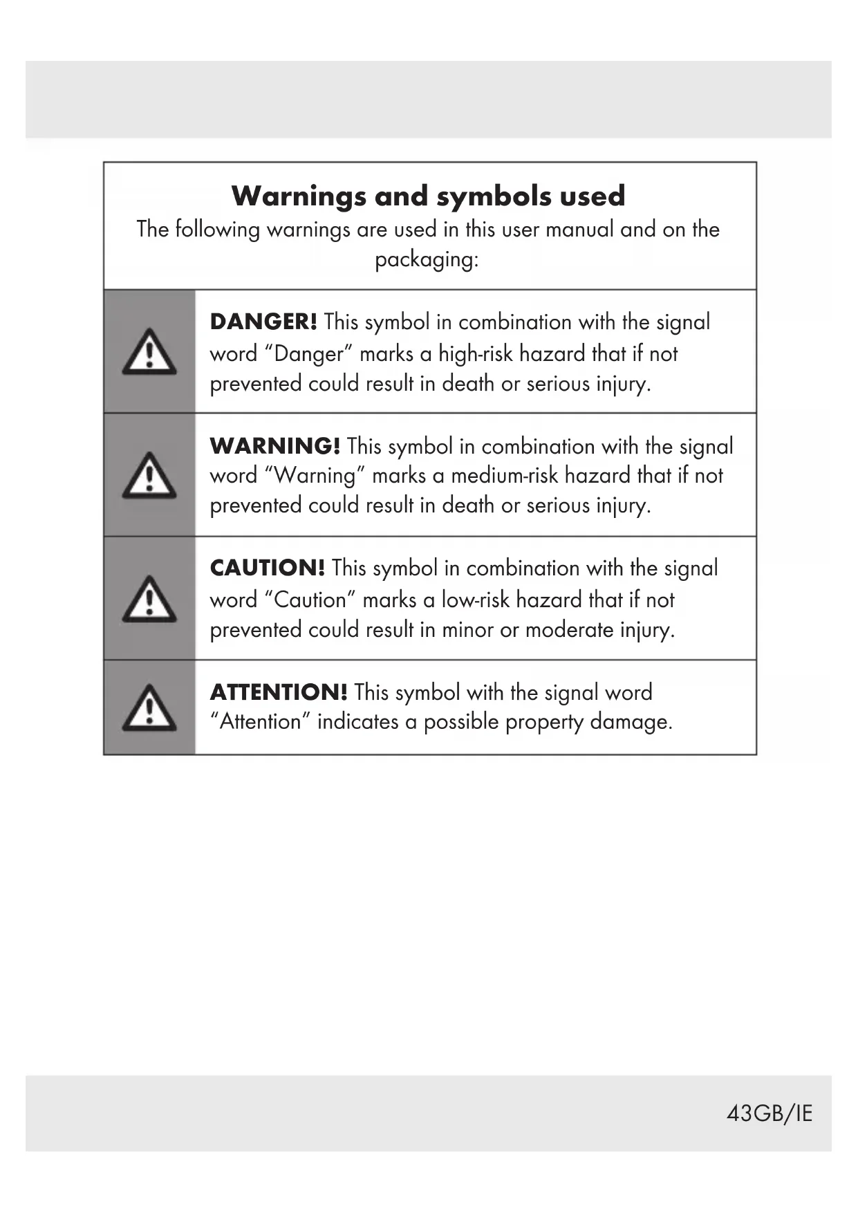 Introduction We congratulate you on the purchase of your new product. You have chosen a high quality product. The instructions for use are part of the product. They contain important information concerning safety, use and disposal. Before using the product, please familiarise yourself with all of the safety information and instructions for use. Only use the product as described and for the specified applications. If you pass the product on to anyone else, please ensure that you also pass on all the documentation with it. Intended use This cordless screwdriver (hereinafter “product” or “power tool”) is designed for screwing in and out screws. Always use the correct accessory tools (attachments and bits) according to the intended use! Observe the technical requirements of this product (see “Technical data“) when purchasing and using accessory tools! The LED work light [] on this product is intended to illuminate the immediate work area.47GB/IE Any other use or modification of the product are considered improper use and can result in hazards such as death, life- threatening injuries and damage. The manufacturer is not liable for any damages caused by improper use. The product is not intended for commercial or similar uses. Scope of delivery
