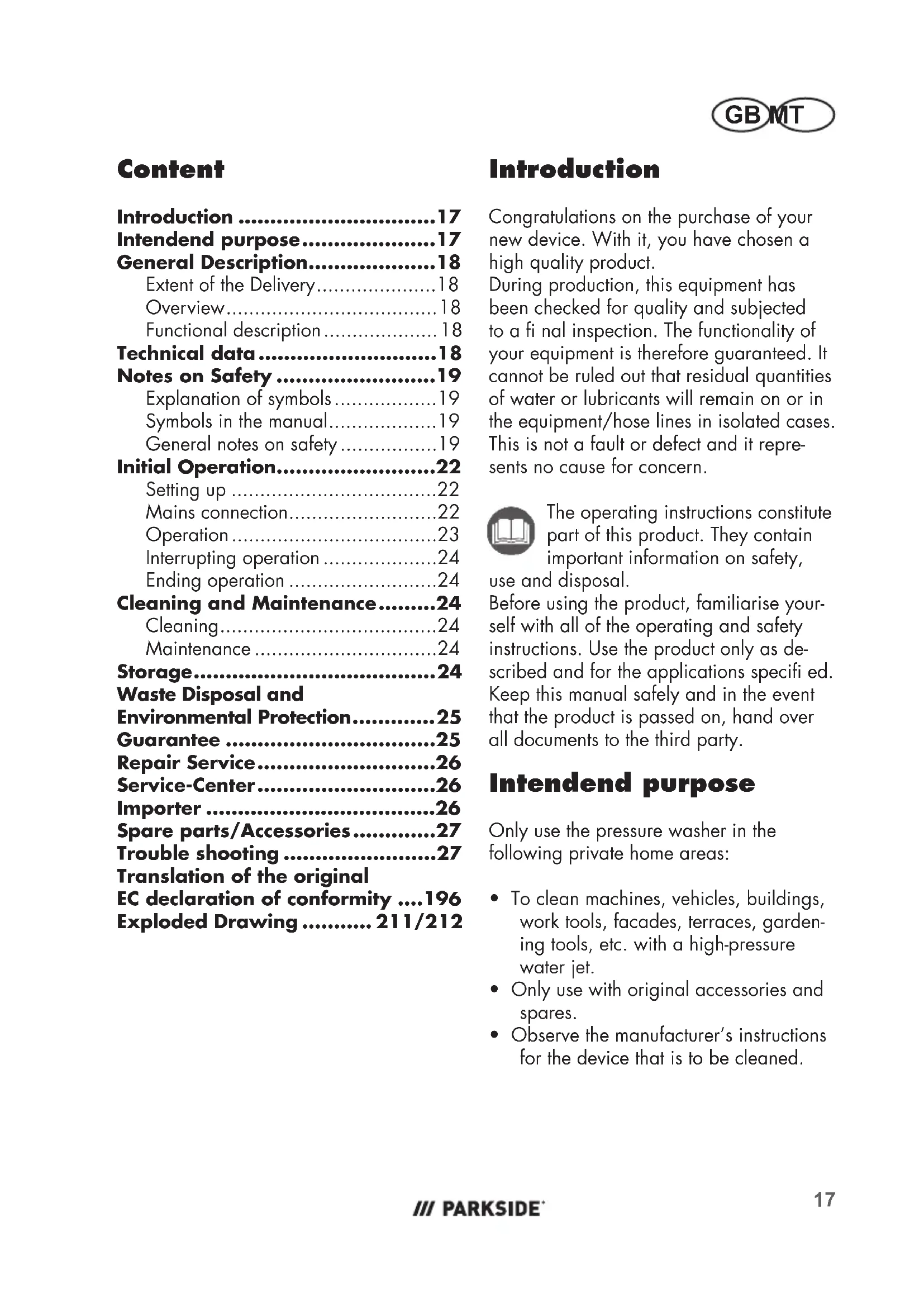 - Return to the manufacturer/distributor. This does not affect accessories enclosed with the old devices or tools without any electrical components. Guarantee Dear Customer, This equipment is provided with a 3-year guarantee from the date of purchase. In case of defects, you have statutory rights against the seller of the product. These statutory rights are not restricted by our guarantee presented below. Terms of Guarantee The term of the guarantee begins on the date of purchase. Please retain the original receipt. This document is required as proof of purchase. If a material or manufacturing defect occurs within three years of the date of purchase of this product, we will repair or replace – at our choice – the product for you free of charge. This guarantee requires the defective equipment and proof of pur- chase to be presented within the three-year period with a brief written description of what constitutes the defect and when it oc- curred. If the defect is covered by our guarantee, you will receive either the repaired product or a new product. No new guarantee pe- riod begins on repair or replacement of the product. Guarantee Period and Statutory Claims for Defects The guarantee period is not extended by the guarantee service. This also applies for replaced or repaired parts. Any damages and defects already present at the time of purchase must be reported immediately af- ter unpacking. Repairs arising after expiry of the guarantee period are chargeable. Guarantee Cover The equipment has been carefully pro- duced in accordance with strict quality guidelines and conscientiously checked prior to delivery. The guarantee applies for all material and manufacturing defects. This guarantee does not extend to cover product parts that are subject to normal wear and may there- fore be considered as wearing parts (e.g. High-pressure hose) or to cover damage to breakable parts (e.g. switches).GB MT