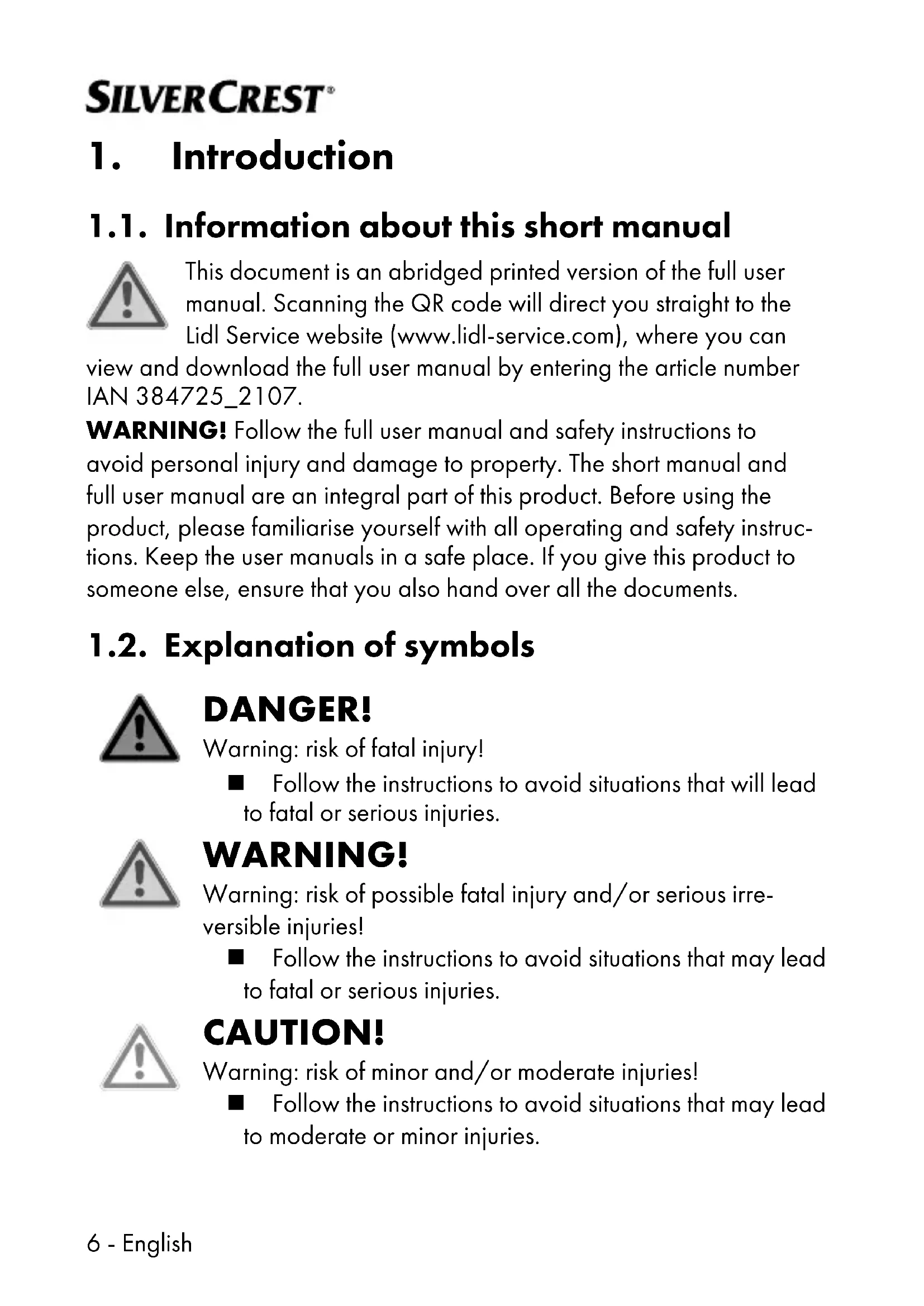 1.1. Information about this short manual This document is an abridged printed version of the full user manual. Scanning the QR code will direct you straight to the Lidl Service website (www.lidl-service.com), where you can view and download the full user manual by entering the article number IAN 384725_2107. WARNING! Follow the full user manual and safety instructions to avoid personal injury and damage to property. The short manual and full user manual are an integral part of this product. Before using the product, please familiarise yourself with all operating and safety instruc- tions. Keep the user manuals in a safe place. If you give this product to someone else, ensure that you also hand over all the documents. 1.2. Explanation of symbols DANGER!