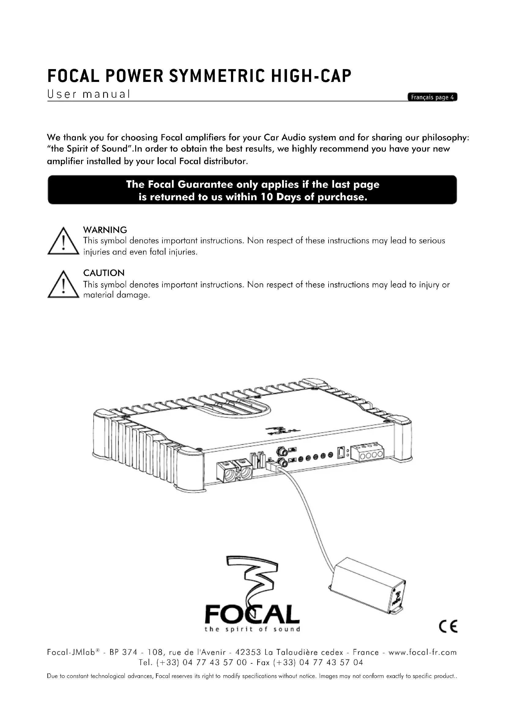 We thank you for choosing Focal amplifiers for your Car Audio system and for sharing our philosophy: “the Spirit of Sound”.In order to obtain the best results, we highly recommend you have your new amplifier installed by your local Focal distributor. The Focal Guarantee only applies if the last page is returned to us within 10 Days of purchase. WARNING This symbol denotes important instructions. Non respect of these instructions may lead to serious injuries and even fatal injuries. CAUTION This symbol denotes important instructions. Non respect of these instructions may lead to injury or material damage. Due to constant technological advances, Focal reserves its right to modify specifications without notice. Images may not conform exactly to specific product.. focal power Symmetric HiGH-cap User manual Français page 4 Focal-JMlab