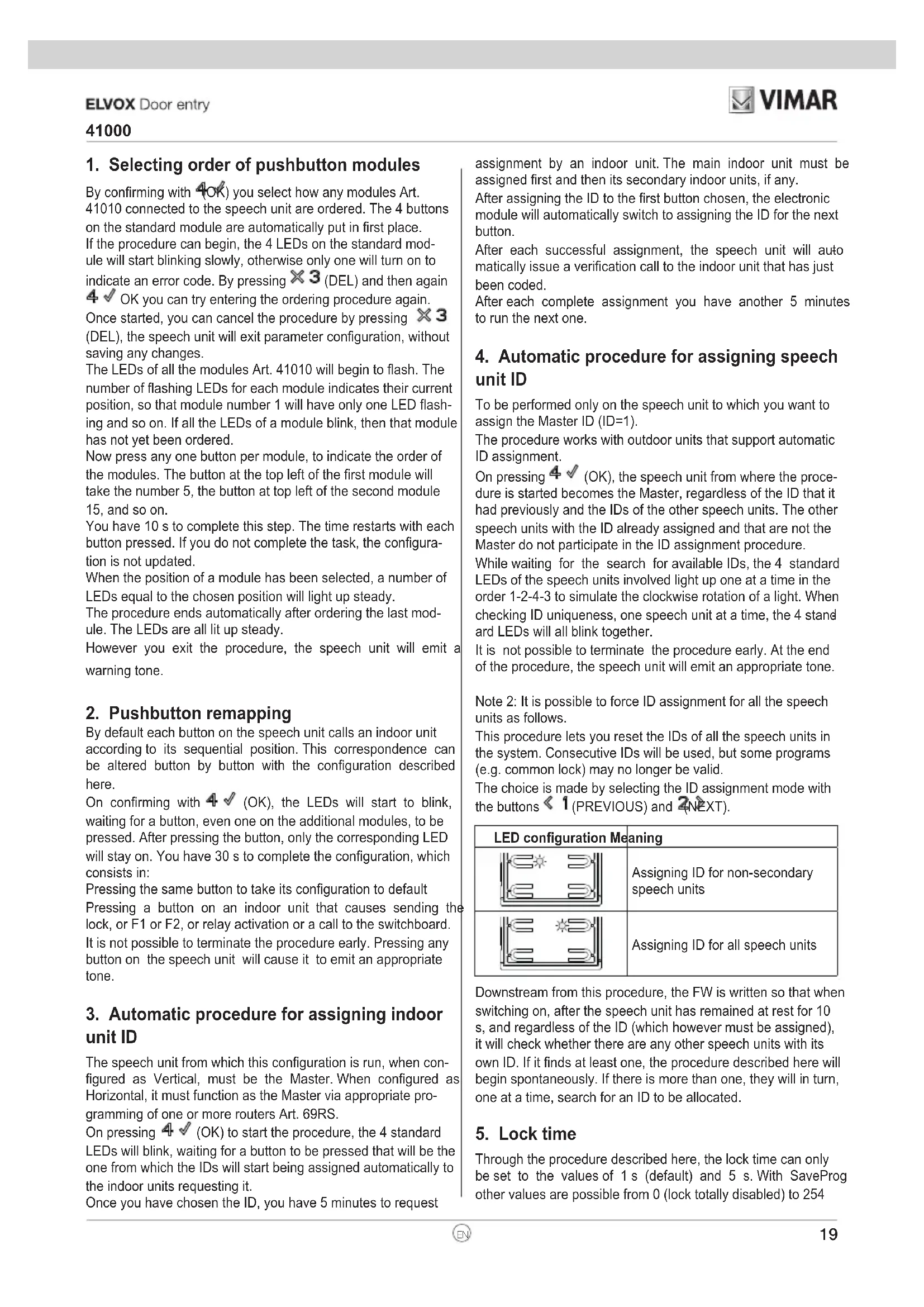 EN1. Selecting order of pushbutton modules By conrming with (OK) you select how any modules Art. 41010 connected to the speech unit are ordered. The 4 buttons on the standard module are automatically put in rst place. If the procedure can begin, the 4 LEDs on the standard mod- ule will start blinking slowly, otherwise only one will turn on to indicate an error code. By pressing (DEL) and then again OK you can try entering the ordering procedure again. Once started, you can cancel the procedure by pressing (DEL), the speech unit will exit parameter conguration, without saving any changes. The LEDs of all the modules Art. 41010 will begin to ash. The number of ashing LEDs for each module indicates their current position, so that module number 1 will have only one LED ash- ing and so on. If all the LEDs of a module blink, then that module has not yet been ordered. Now press any one button per module, to indicate the order of the modules. The button at the top left of the rst module will take the number 5, the button at top left of the second module 15, and so on. You have 10 s to complete this step. The time restarts with each button pressed. If you do not complete the task, the congura- tion is not updated. When the position of a module has been selected, a number of LEDs equal to the chosen position will light up steady. The procedure ends automatically after ordering the last mod- ule. The LEDs are all lit up steady. However you exit the procedure, the speech unit will emit a warning tone.