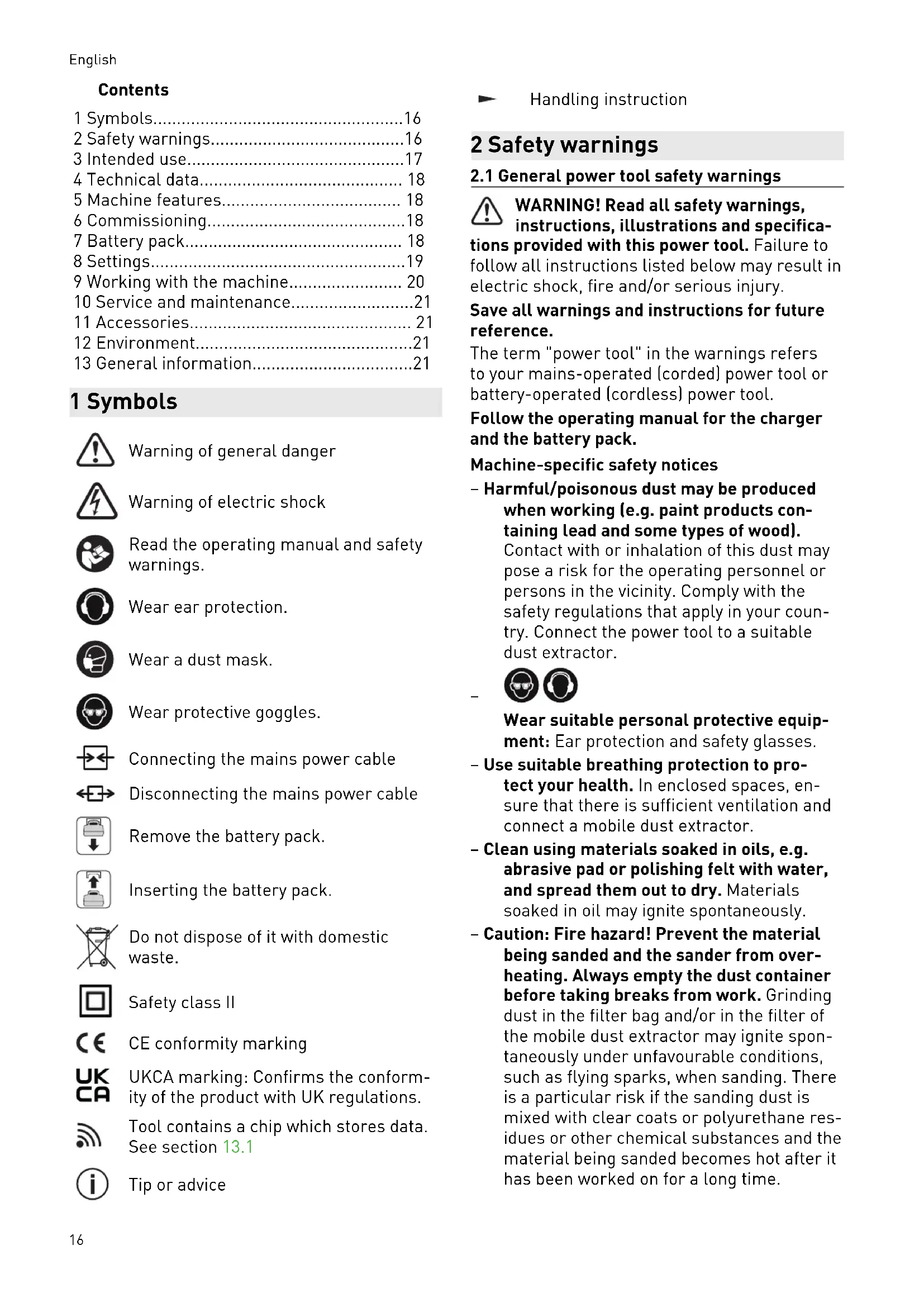 Wear suitable personal protective equip ment: Ear protection and safety glasses. – Use suitable breathing protection to pro tect your health. In enclosed spaces, en sure that there is sufficient ventilation and connect a mobile dust extractor. – Clean using materials soaked in oils, e.g. abrasive pad or polishing felt with water, and spread them out to dry. Materials soaked in oil may ignite spontaneously. – Caution: Fire hazard! Prevent the material being sanded and the sander from over heating. Always empty the dust container before taking breaks from work. Grinding dust in the filter bag and/or in the filter of the mobile dust extractor may ignite spon taneously under unfavourable conditions, such as flying sparks, when sanding. There is a particular risk if the sanding dust is mixed with clear coats or polyurethane res idues or other chemical substances and the material being sanded becomes hot after it has been worked on for a long time. English 16– If the power tool is dropped or falls, check for damage to the machine and sanding pad. Remove the sanding pad for closer inspection. Have the damaged parts re paired before use. Broken sanding pads and damaged machines can cause injuries and machine instability. – An electrostatic charge may build up when using the long-life dust bag. If possible, always use the power tool with an anti- static suction hose (AS). A slight electric shock may cause you to panic briefly and become distracted, which may result in an accident. – Only use the mains adapter with this de vice. – Only use the mains adapter together with an original Festool plug-it cable. – Only for AS/NZS: The tool shall always be supplied via residual current device with a rated residual current of 30mA or less. – Do not use power supply units to operate cordless power tools. Only use the inten ded battery packs. Do not use third-party chargers to charge the battery packs. The use of accessories not expressly authorised by the manufacturer can result in electric shocks and/or serious accidents.