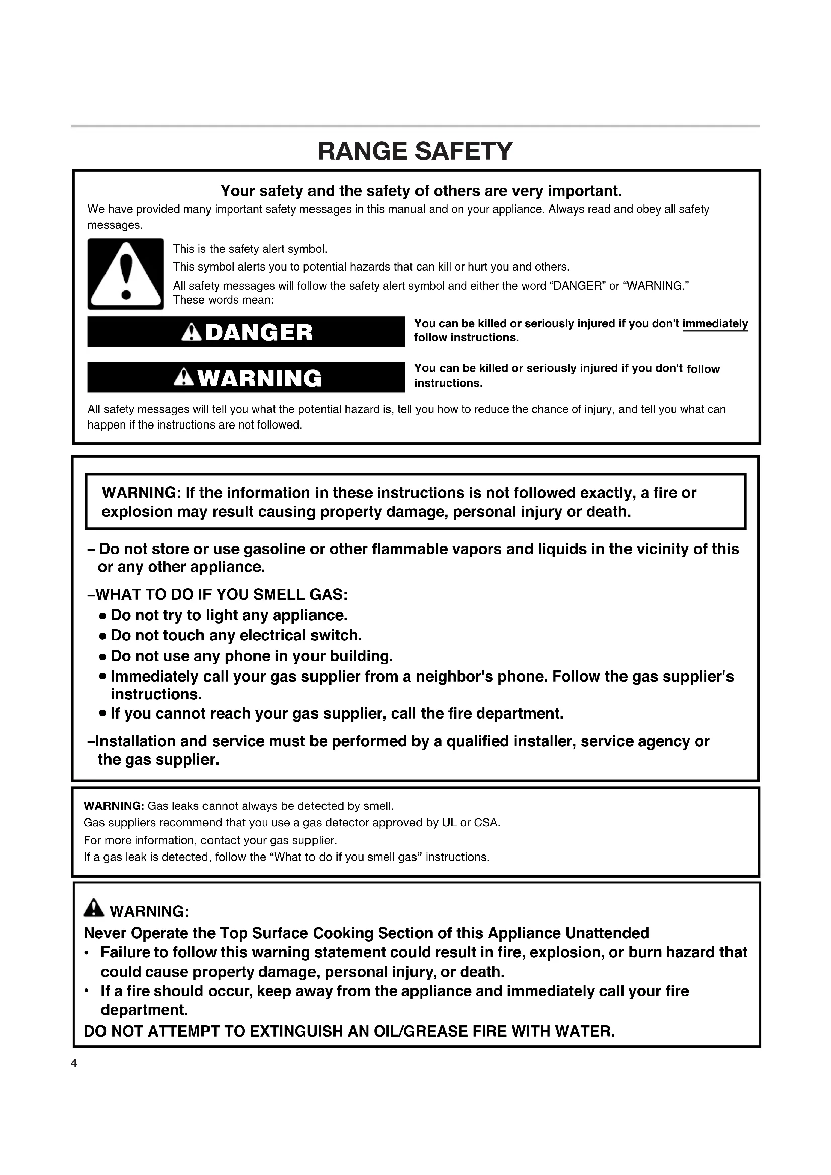 En EE.UU. ...................................................................................41 En Canadá ..................................................................................41 Accesorios ..................................................................................414 RANGE SAFETY You can be killed or seriously injured if you don't immediately You can be killed or seriously injured if you don'tfollow All safety messages will tell you what the potential hazard is, tell you how to reduce the chance of injury, and tell you what can happen if the instructions are not followed. Your safety and the safety of others are very important. We have provided many important safety messages in this manual and on your appliance. Always read and obey all safety messages.This is the safety alert symbol.This symbol alerts you to potential hazards that can kill or hurt you and others.All safety messages will follow the safety alert symbol and either the word “DANGER” or “WARNING.”These words mean:follow instructions.instructions. DANGER WARNING