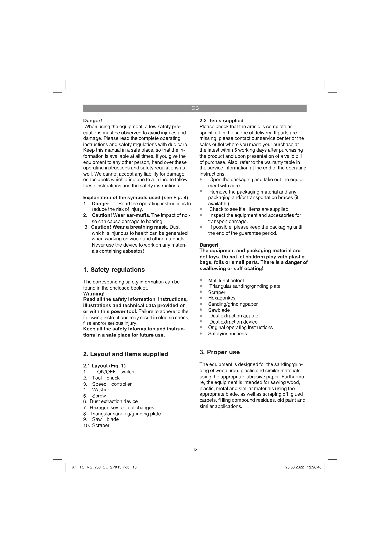 The equipment is designed for the sanding/grin- ding of wood, iron, plastic and similar materials using the appropriate abrasive paper. Furthermo- re, the equipment is intended for sawing wood, plastic, metal and similar materials using the appropriate blade, as well as scraping off glued carpets, fi lling compound residues, old paint and similar applications. Anl_TC_MG_250_CE_SPK13.indb 13Anl_TC_MG_250_CE_SPK13.indb 13 25.08.2022 13:36:4025.08.2022 13:36:40GB