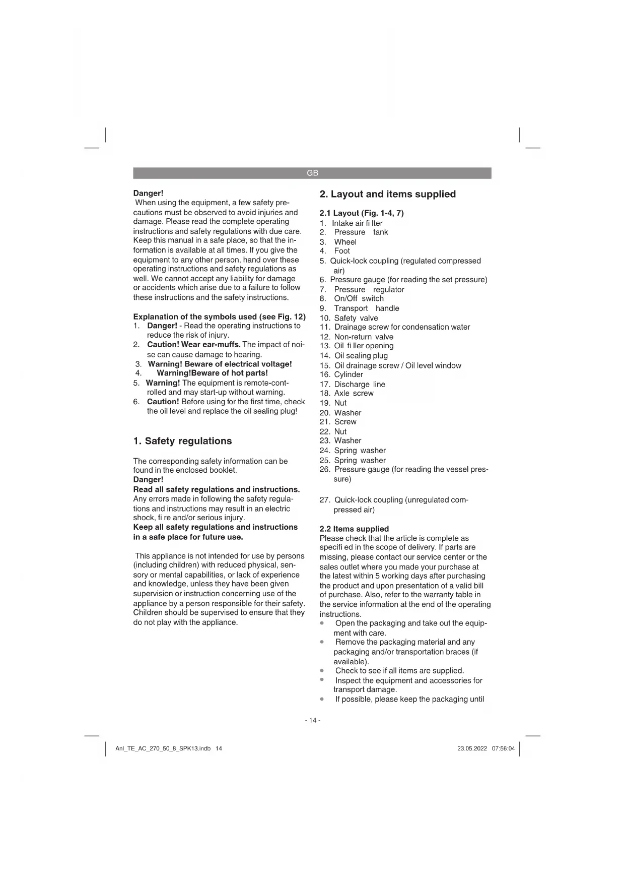 pressure regulator. For EU countries only Never place any electric power tools in your household refuse. To comply with European Directive 2012/19/EC concerning old electric and electronic equipment and its implementation in national laws, old electric power tools have to be separated from other waste and disposed of in an environment-friendly fashion, e.g. by taking to a recycling depot. Recycling alternative to the return request: As an alternative to returning the equipment to the manufacturer, the owner of the electrical equipment must make sure that the equipment is properly disposed of if he no longer wants to keep the equipment. The old equipment can be returned to a suitable collection point that will dispose of the equipment in accordance with the national recycling and waste disposal regulations. This does not apply to any ac- cessories or aids without electrical components supplied with the old equipment. Please note that batteries and lamps (e.g. light bulbs) must be removed from the tool before it is dispo- sed of. The reprinting or reproduction by any other means, in whole or in part, of documentation and papers ac- companying products is permitted only with the express consent of the Einhell Germany AG. Subject to technical changes Anl_TE_AC_270_50_8_SPK13.indb 18Anl_TE_AC_270_50_8_SPK13.indb 18 23.05.2022 07:56:0523.05.2022 07:56:05GB