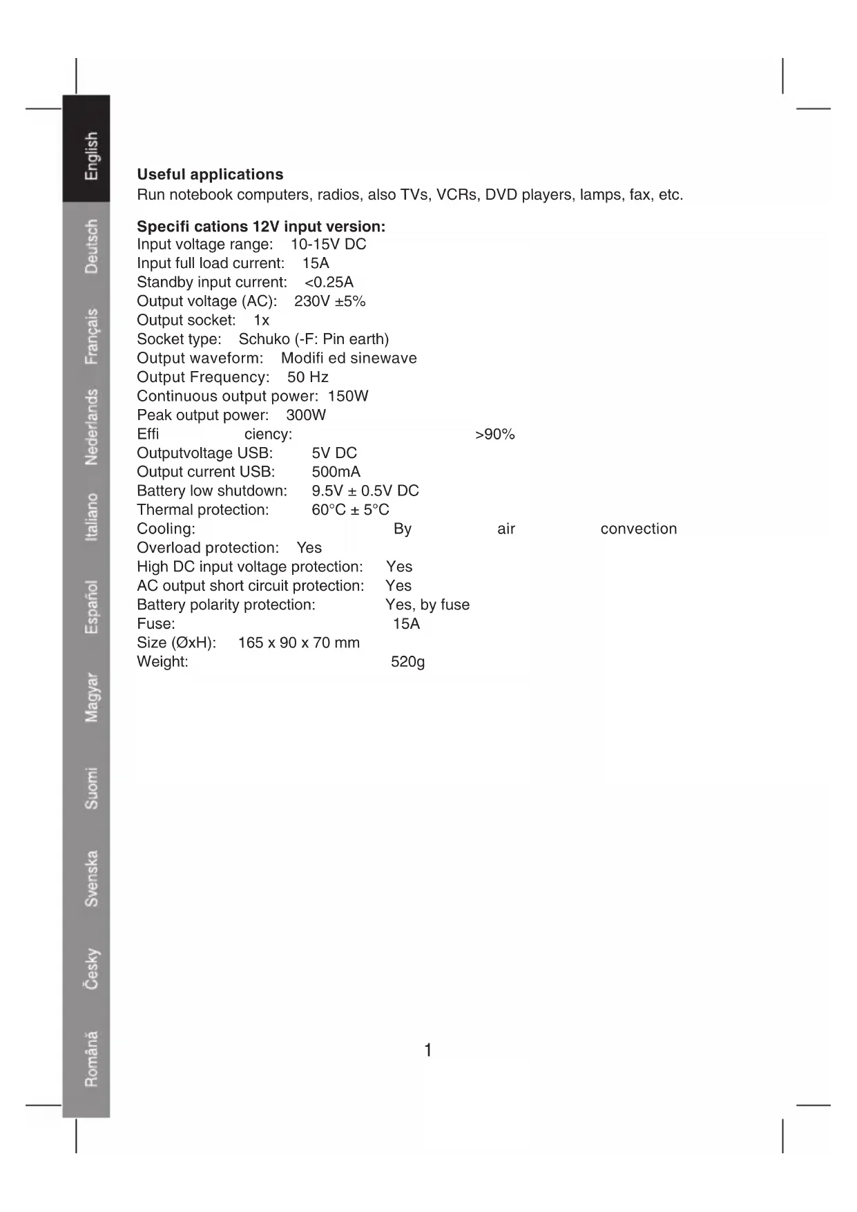 OUTPUTUseful applications Run notebook computers, radios, also TVs, VCRs, DVD players, lamps, fax, etc. Specifi cations 12V input version: Input voltage range: 10-15V DC Input full load current: 15A Standby input current: <0.25A Output voltage (AC): 230V ±5% Output socket: 1x Socket type: Schuko (-F: Pin earth) Output waveform: Modifi ed sinewave Output Frequency: 50 Hz Continuous output power: 150W Peak output power: 300W Effi ciency: >90% Outputvoltage USB: 5V DC Output current USB: 500mA Battery low shutdown: 9.5V ± 0.5V DC Thermal protection: 60°C ± 5°C Cooling: By air convection Overload protection: Yes High DC input voltage protection: Yes AC output short circuit protection: Yes Battery polarity protection: Yes, by fuse Fuse: 15A Size (ØxH): 165 x 90 x 70 mm Weight: 520g 1Specifi cations 24V input version Input voltage range: 20-30V DC Input full load current: 10A Standby input current: <0.2A Output voltage (AC): 230V ±5% Output socket: 1x Socket type: Schuko (-F: Pin earth) Output waveform: Pure sinewave Output Frequency: 50 Hz Continuous output power: 150W Peak output power: 300W Effi ciency: >90% Outputvoltage USB: 5V DC Output current USB: 500mA Battery low shutdown: 19.5V ± 0.8V DC Thermal protection: 60°C ± 5°C Cooling: By air convection Overload protection: Yes High DC input voltage protection: Yes AC output short circuit protection: Yes Battery polarity protection: Yes, by fuse Fuse: 10A Size (ØxH): 165 x 90 x 70 mm Weight: 520g 2Operating instruction: