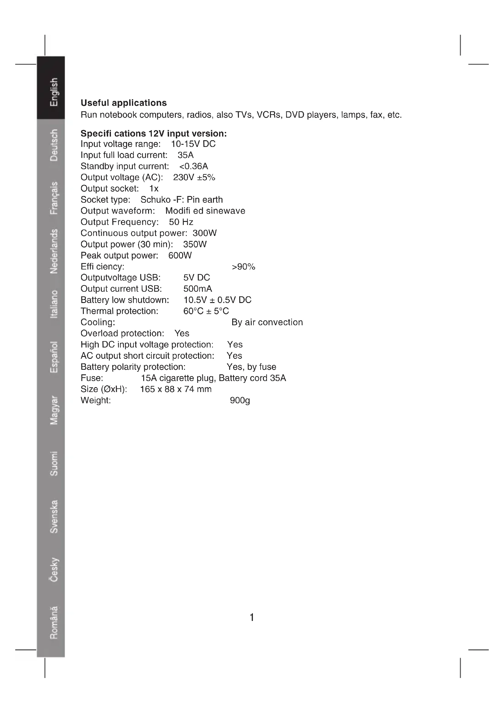 Make sure that the maximum power demand of the connected appliances does not exceed the output power of this inverter (300W continuously, 350W for max. 30 minutes)