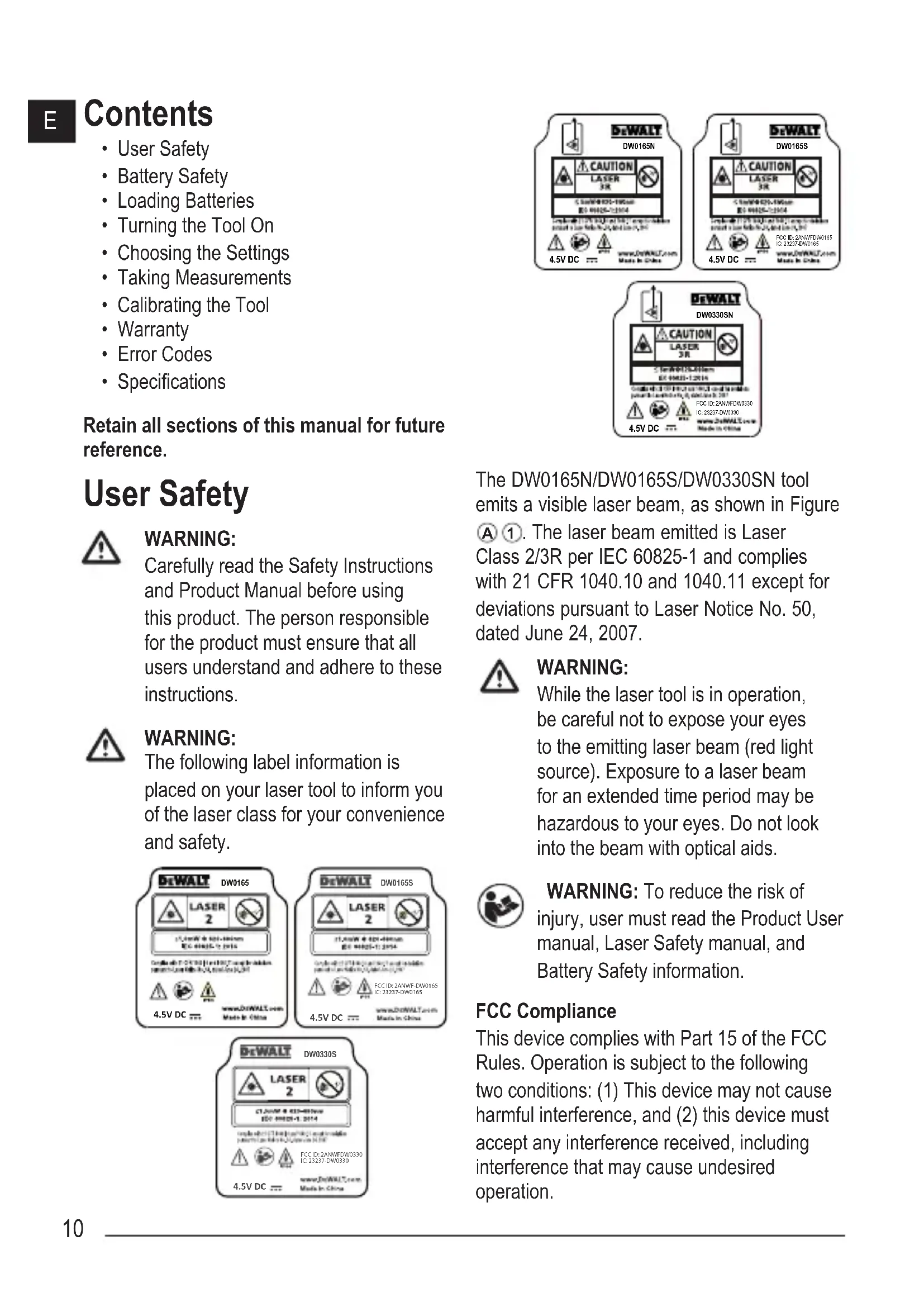 The following label information is placed on your laser tool to inform you of the laser class for your convenience and safety. DW0165S4.5V DCFCC ID: 2ANWFDW0165IC: 23237-DW0165DW0165N4.5V DCDW0330SN4.5V DCFCC ID: 2ANWFDW0330IC: 23237-DW0330 The DW0165N/DW0165S/DW0330SN tool emits a visible laser beam, as shown in Figure