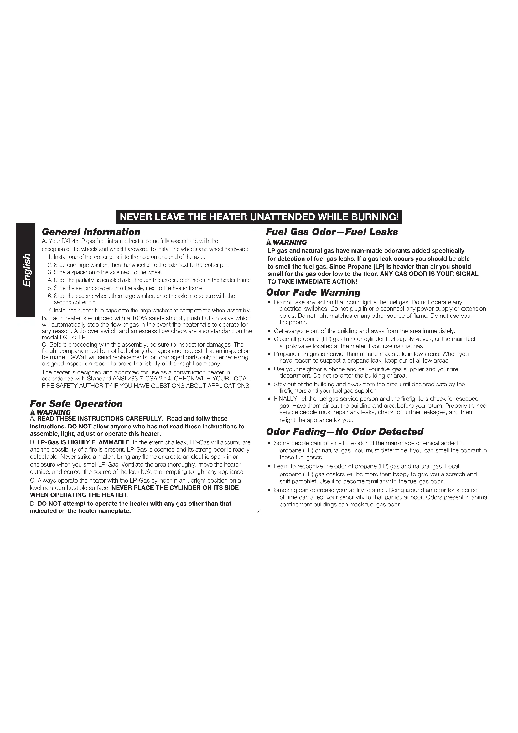 B. Each heater is equipped with a 100% safety shutoff, push button valve which will automatically stop the ow of gas in the event the heater fails to operate for any reason. A tip over switch and an excess ow check are also standard on the model DXH45LP. C. Before proceeding with this assembly, be sure to inspect for damages. The freight company must be notied of any damages and request that an inspection be made. DeWalt will send replacements for damaged parts only after receiving a signed inspection report to prove the liability of the freight company. The heater is designed and approved for use as a construction heater in accordance with Standard ANSI Z83.7-CSA 2.14. CHECK WITH YOUR LOCAL FIRE SAFETY AUTHORITY IF YOU HAVE QUESTIONS ABOUT APPLICATIONS. For Safe Operation A. READ THESE INSTRUCTIONS CAREFULLY. Read and follw these instructions. DO NOT allow anyone who has not read these instructions to assemble, light, adjust or operate this heater. B. LP‑Gas IS HIGHLY FLAMMABLE. In the event of a leak, LP-Gas will accumulate and the possibility of a re is present. LP-Gas is scented and its strong odor is readily detectable. Never strike a match, bring any ame or create an electric spark in an enclosure when you smell LP-Gas. Ventilate the area thoroughly, move the heater outside, and correct the source of the leak before attempting to light any appliance. C. Always operate the heater with the LP-Gas cylinder in an upright position on a level non-combustible surface. NEVER PLACE THE CYLINDER ON ITS SIDE WHEN OPERATING THE HEATER. D. DO NOT attempt to operate the heater with any gas other than that indicated on the heater nameplate.