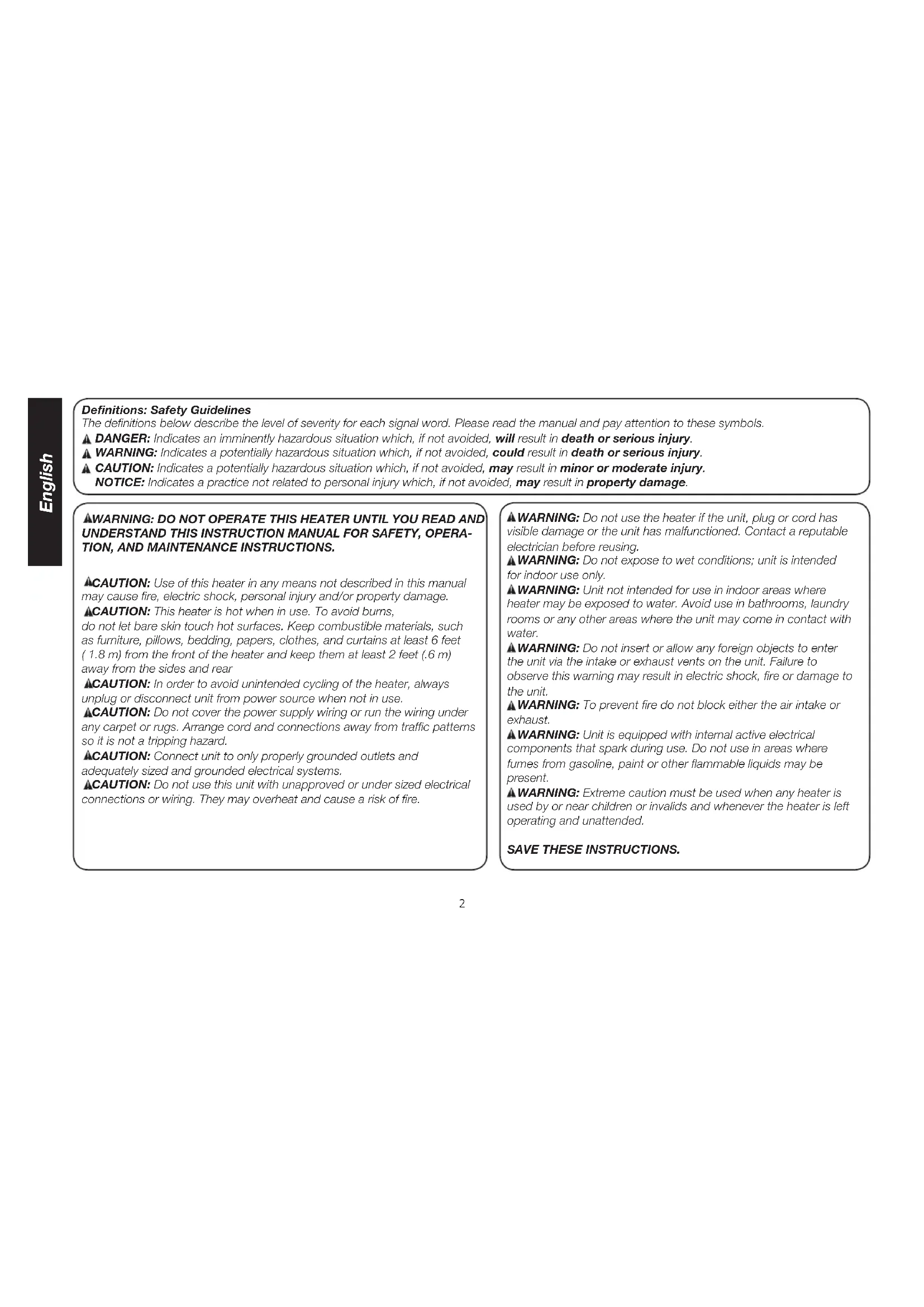 UNDERSTAND THIS INSTRUCTION MANUAL FOR SAFETY, OPERA- TION, AND MAINTENANCE INSTRUCTIONS. CAUTION: Use of this heater in any means not described in this manual may cause fire, electric shock, personal injury and/or property damage. CAUTION: This heater is hot when in use. To avoid burns, do not let bare skin touch hot surfaces. Keep combustible materials, such as furniture, pillows, bedding, papers, clothes, and curtains at least 6 feet ( 1.8 m) from the front of the heater and keep them at least 2 feet (.6 m) away from the sides and rear CAUTION: In order to avoid unintended cycling of the heater, always unplug or disconnect unit from power source when not in use. CAUTION: Do not cover the power supply wiring or run the wiring under any carpet or rugs. Arrange cord and connections away from traffic patterns so it is not a tripping hazard. CAUTION: Connect unit to only properly grounded outlets and adequately sized and grounded electrical systems. CAUTION: Do not use this unit with unapproved or under sized electrical connections or wiring. They may overheat and cause a risk of fire.English
