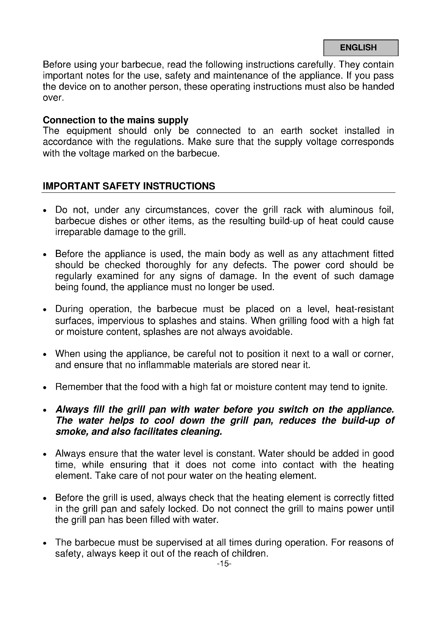 -14-Before using your barbecue, read the following instructions carefully. They contain important notes for the use, safety and maintenance of the appliance. If you pass the device on to another person, these operating instructions must also be handed over. Connection to the mains supply The equipment should only be connected to an earth socket installed in accordance with the regulations. Make sure that the supply voltage corresponds with the voltage marked on the barbecue.