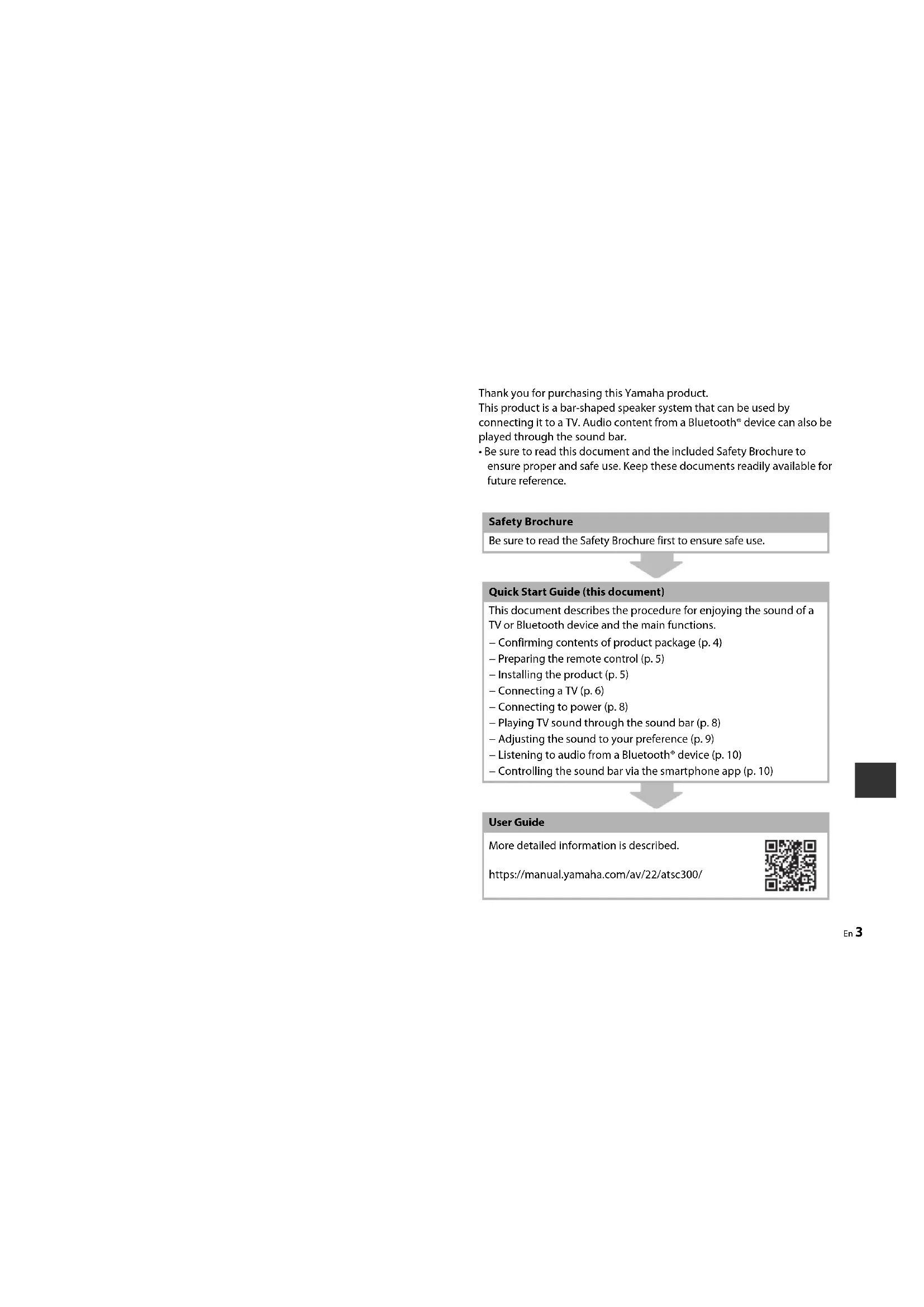- Be sure to read this document and the included Safety Brochure to ensure proper and safe use. Keep these documents readily available for future reference. Safety Brochure Be sure to read the Safety Brochure first to ensure safe use. Quick Start Guide (this document) This document describes the procedure for enjoying the sound of a TV or Bluetooth device and the main functions. − Confirming contents of product package (p. 4) − Preparing the remote control (p. 5) − Installing the product (p. 5) − Connecting a TV (p. 6) − Connecting to power (p. 8) − Playing TV sound through the sound bar (p. 8) − Adjusting the sound to your preference (p. 9) − Listening to audio from a Bluetooth® device (p. 10) − Controlling the sound bar via the smartphone app (p. 10) User Guide More detailed information is described. https://manual.yamaha.com/av/22/atsc300/4 En This product includes the following main devices and accessories. Take out all items from the box and make sure that all items are present. Confirming contents of product package Sound bar (ATS-CUC300) Remote control Digital optical audio cable Power cords (×2) Mounting template Spacers (A: ×2, B: ×2 on 1 sheet) NOTE