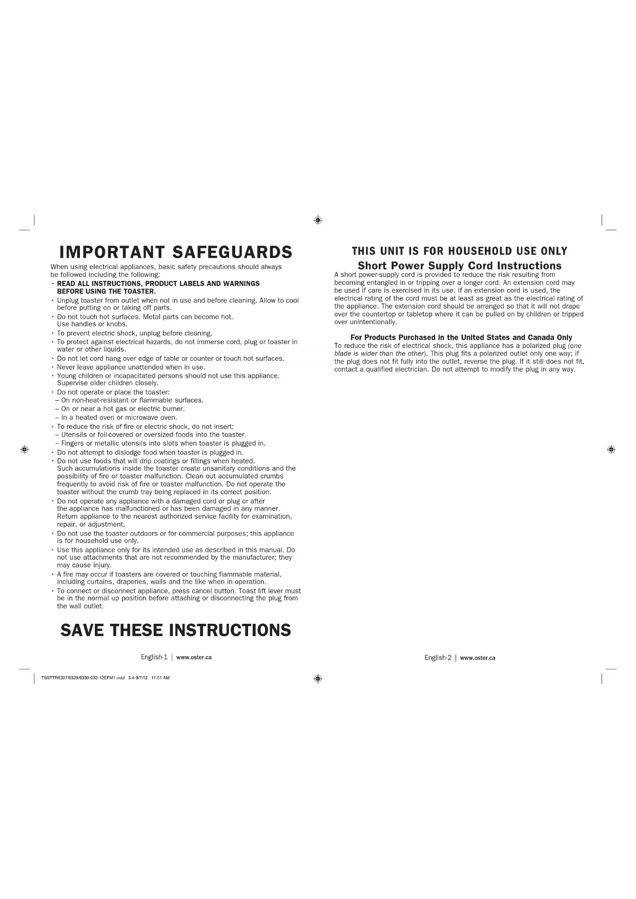 , veuillez visiter notre site au www.oster.ca TSSTTR6307/6329/6330-033-12EFM1.indd 1-2 9/7/12 11:51 AMTHIS UNIT IS FOR HOUSEHOLDUSEONLY Short Power Supply Cord Instructions Ashortpower-supply cord is provided to reduce the risk resulting from becoming entangled inor tripping over a longer cord. An extension cord may beused if care is exercised in its use. Ifan extension cord is used, the electrical rating of the cord must be atleast as great as the electrical rating of the appliance. Theextension cord should be arranged so that it will not drape over the countertop or tabletop where it can be pulled on by children or tripped overunintentionally. For Products Purchased in the United States and Canada Only To reduce the risk of electrical shock, this appliance has a polarized plug (one blade is wider than the other). This plug fits apolarized outlet only one way; if the plug does not fit fully intothe outlet, reverse the plug. If it still does not fit, contact a qualified electrician. Do not attempt to modify the plug in any way. IMPORTANT SAFEGUARDS When using electrical appliances, basic safety precautions shouldalways befollowed including thefollowing: