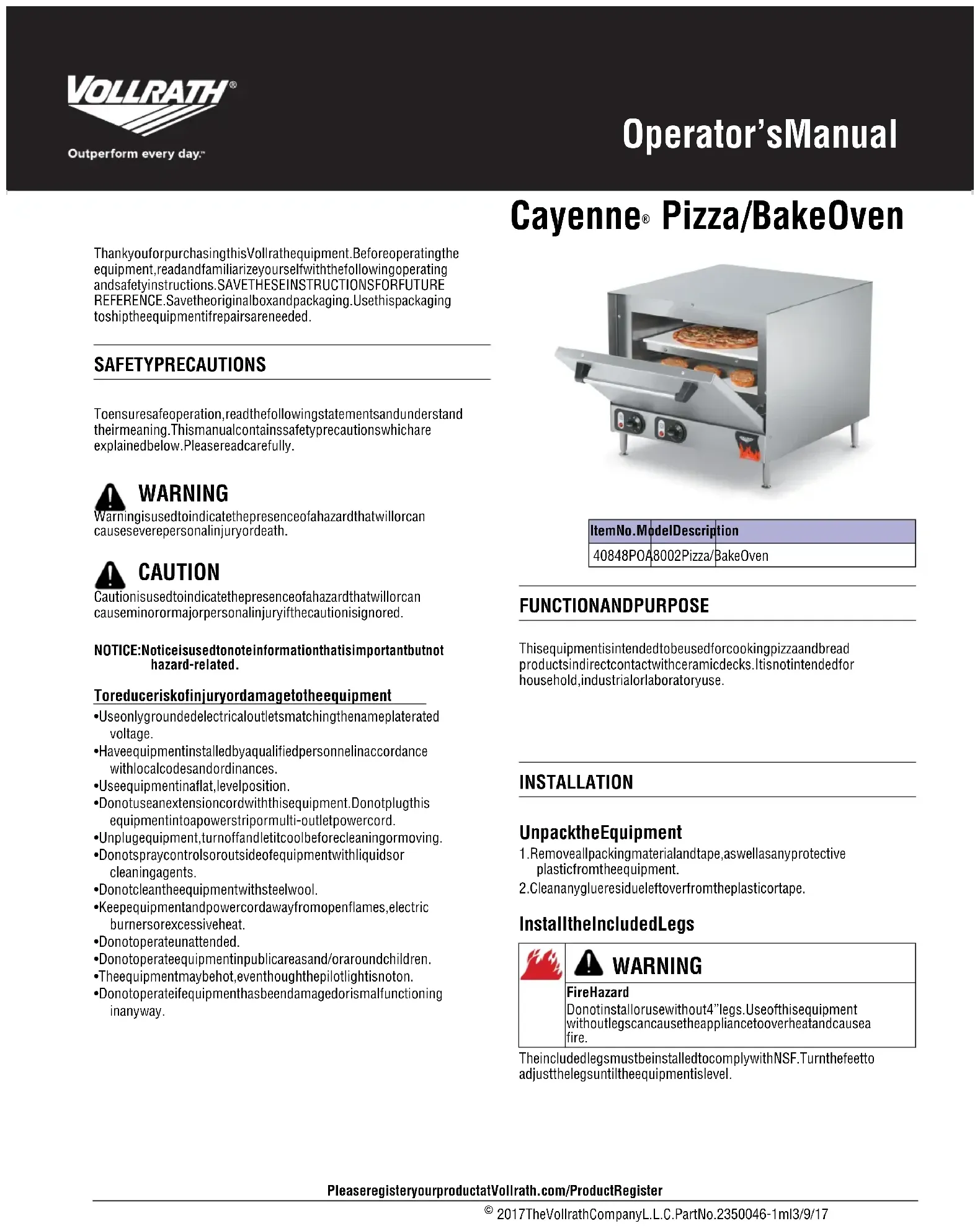 40848 - Pizza oven Vollrath - Free user manual and instructions