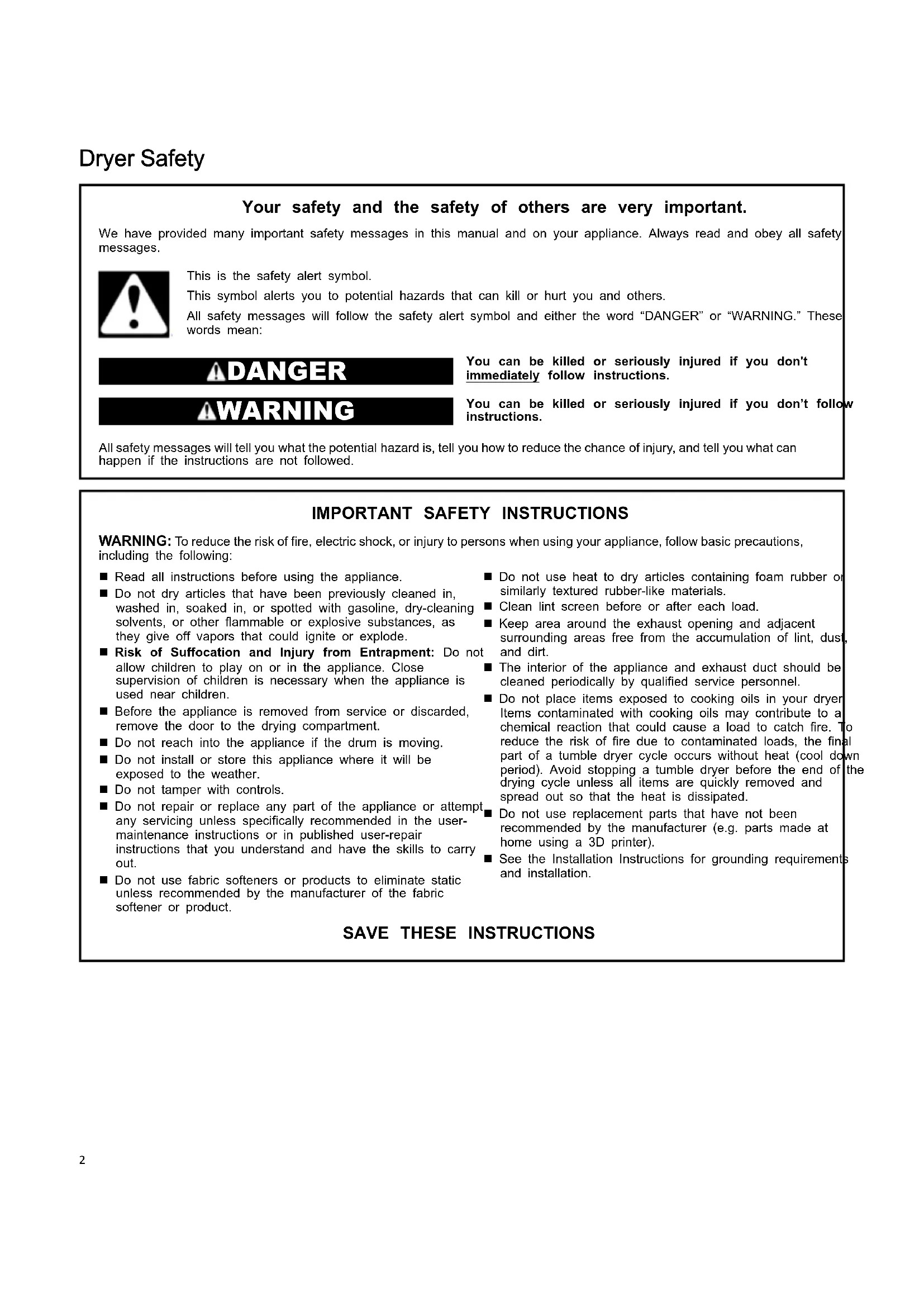 WARNING: To reduce the risk of fire, electric shock, or injury to persons when using your appliance, follow basic precautions, including the following: Read all instructions before using the appliance. Do not dry articles that have been previously cleaned in, washed in, soaked in, or spotted with gasoline, dry-cleaning solvents, or other flammable or explosive substances, as they give off vapors that could ignite or explode. Risk of Suffocation and Injury from Entrapment: Do not allow children to play on or in the appliance. Close supervision of children is necessary when the appliance is used near children. Before the appliance is removed from service or discarded, remove the door to the drying compartment. Do not reach into the appliance if the drum is moving. Do not install or store this appliance where it will be exposed to the weather. Do not tamper with controls. Do not repair or replace any part of the appliance or attempt any servicing unless specifically recommended in the user- maintenance instructions or in published user-repair instructions that you understand and have the skills to carry out. Do not use fabric softeners or products to eliminate static unless recommended by the manufacturer of the fabric softener or product. Do not use heat to dry articles containing foam rubber or similarly textured rubber-like materials. Clean lint screen before or after each load. Keep area around the exhaust opening and adjacent surrounding areas free from the accumulation of lint, dust, and dirt. The interior of the appliance and exhaust duct should be cleaned periodically by qualified service personnel. Do not place items exposed to cooking oils in your dryer. Items contaminated with cooking oils may contribute to a chemical reaction that could cause a load to catch fire. To reduce the risk of fire due to contaminated loads, the final part of a tumble dryer cycle occurs without heat (cool down period). Avoid stopping a tumble dryer before the end of the drying cycle unless all items are quickly removed and spread out so that the heat is dissipated. Do not use replacement parts that have not been recommended by the manufacturer (e.g. parts made at home using a 3D printer). See the Installation Instructions for grounding requirements and installation.