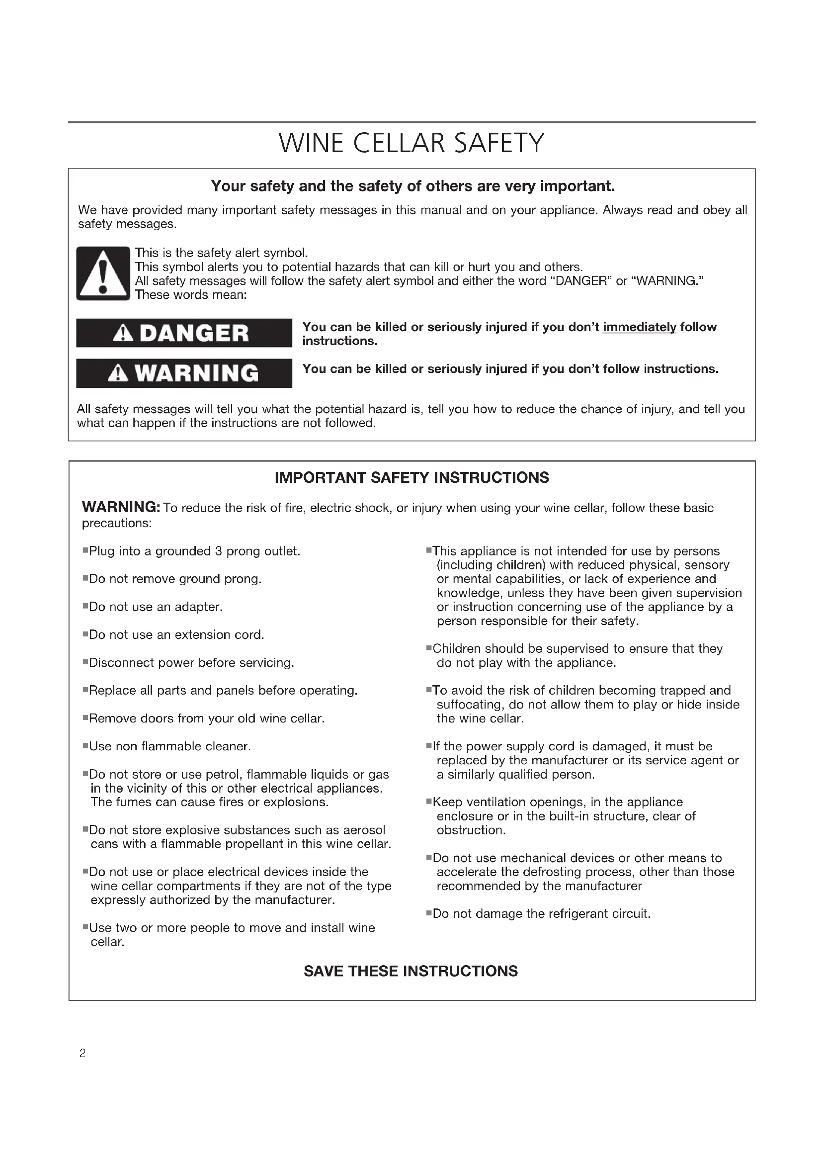To reduce the risk of fire, electric shock, or injury when using your wine cellar, follow these basic precautions: This is the safety alert symbol. This symbol alerts you to potential hazards that can kill or hurt you and others. All safety messages will follow the safety alert symbol and either the word “DANGER” or “WARNING.” These words mean:
