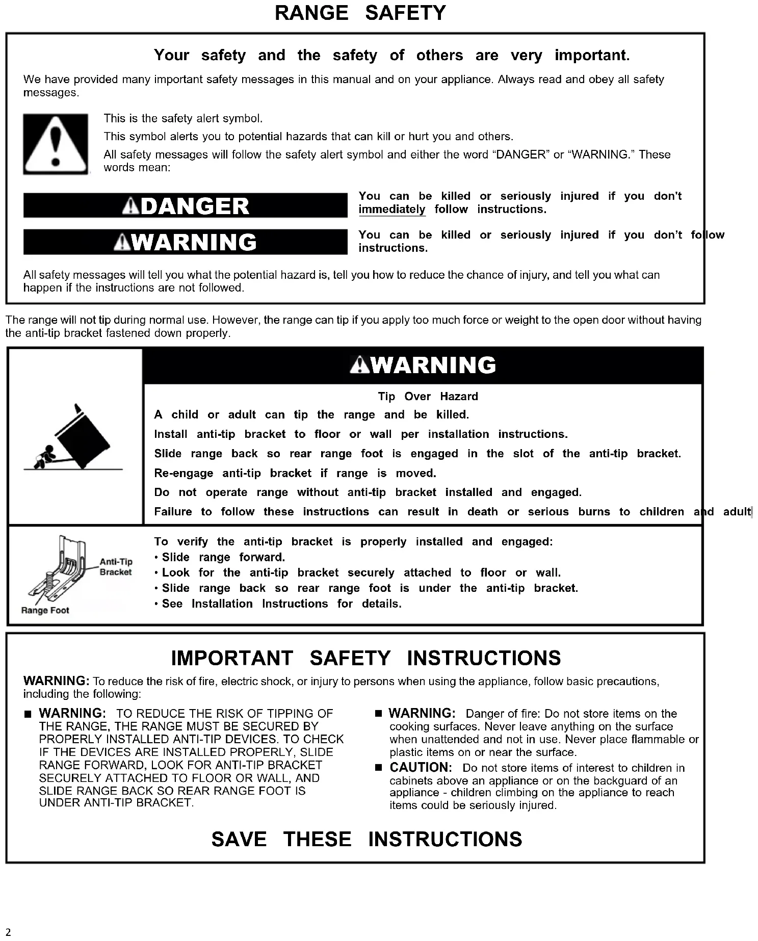 the range is cold, turn off the range and contact a qualified electrician. If You Need Assistance or Service: Please reference the Quick Start Guide for contact information. Moving the Range WARNING Tip Over Hazard A child or adult can tip the range and be killed. Install anti-tip bracket to floor or wall per installation instructions. Slide range back so rear range foot is engaged in the slot of the anti-tip bracket. Re-engage anti-tip bracket if range is moved. Do not operate range without anti-tip bracket installed and engaged. Failure to follow these instructions can result in death or serious burns to children and adults. When moving range, slide range onto cardboard or hardboard to avoid damaging the floor covering. If removing the range is necessary for cleaning or maintenance: For power supply cord-connected ranges: