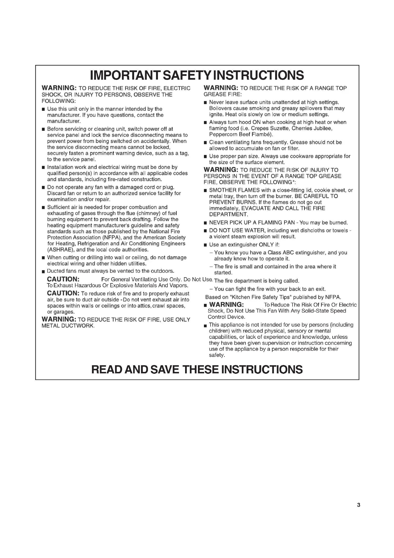 INSTRUCTIONS For General Ventilating Use Only. Do Not Use To Exhaust Hazardous Or Explosive Materials And Vapors. This appliance is not intended for use by persons (including children) with reduced physical, sensory or mental capabilities, or lack of experience and knowledge, unless they have been given supervision or instruction concerning use of the appliance by a person responsible for their safety. To Reduce The Risk Of Fire Or Electric Shock, Do Not Use This Fan With Any Solid-State Speed Control Device. Ducted fans must always be vented to the outdoors.4 INSTALLATION REQUIREMENTS Tools and Parts Gather the required tools and parts before starting installation.Read and follow the instructions provided withanytools listed here. Tools needed Parts supplied Remove parts from package. Check that all parts are included. Parts needed For 3