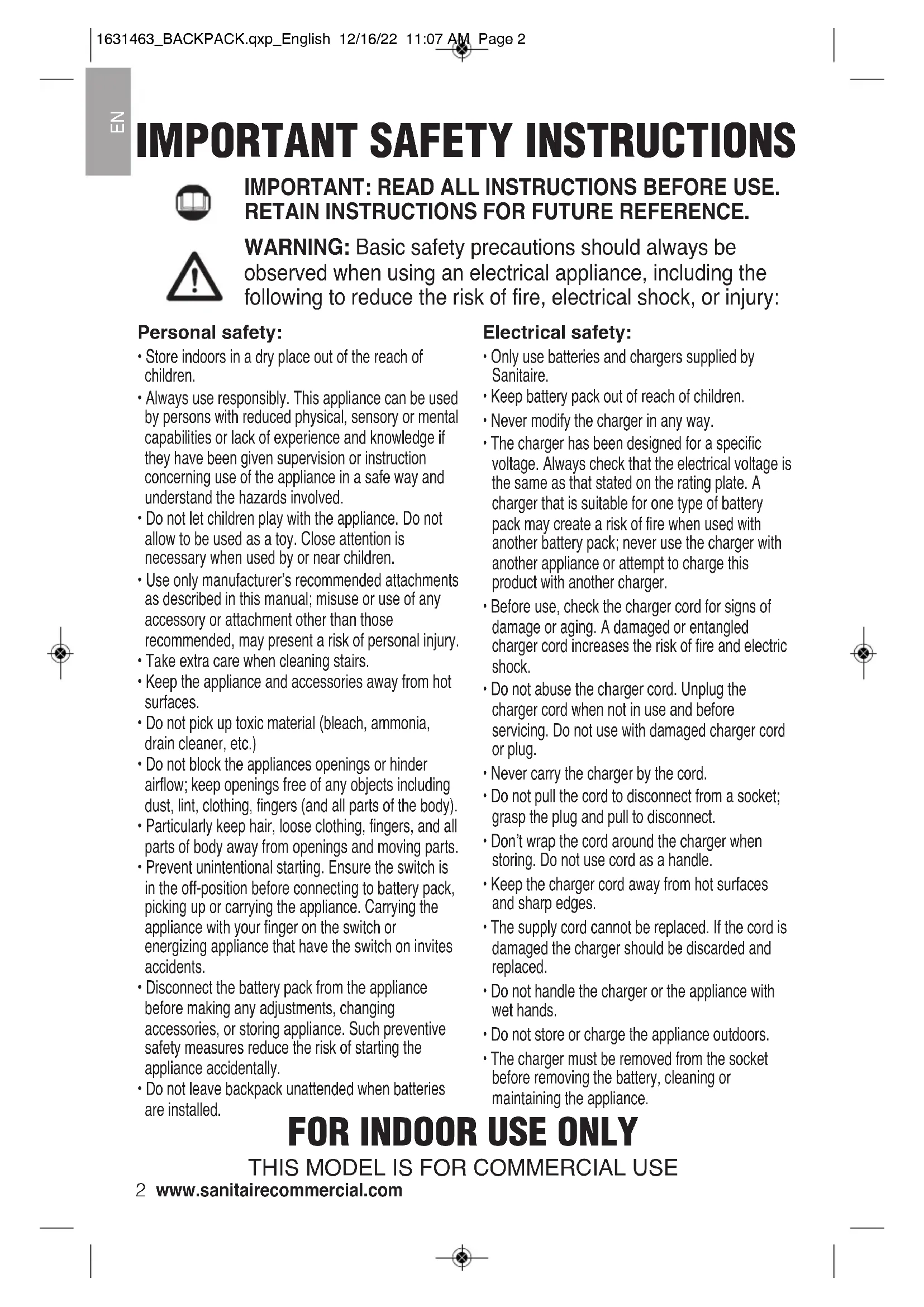 ABOVE. Some states do not allow limitations on how long an implied warranty last so the above limitation may not apply to you. NOTE: Please keep your original sales receipt. Itprovides proof of date of purchase in the event ofa warranty claim. Service information If your Sanitaire product should require service You will find the nearest Sanitaire Authorized Service Center in your area online at sanitairecommercial.com under service locator or contact Sanitaire Customer Service. If you need information about repairs or replacement parts, or if you have questions about your warranty, contact Sanitaire Customer Service. Website: www.sanitairecommercial.comCall: Sanitaire Customer Service 1-800-800-8975 1631463_BACKPACK.qxp_English 12/16/22 11:07 AM Page 6Aspirateur commercial dorsal sans fil