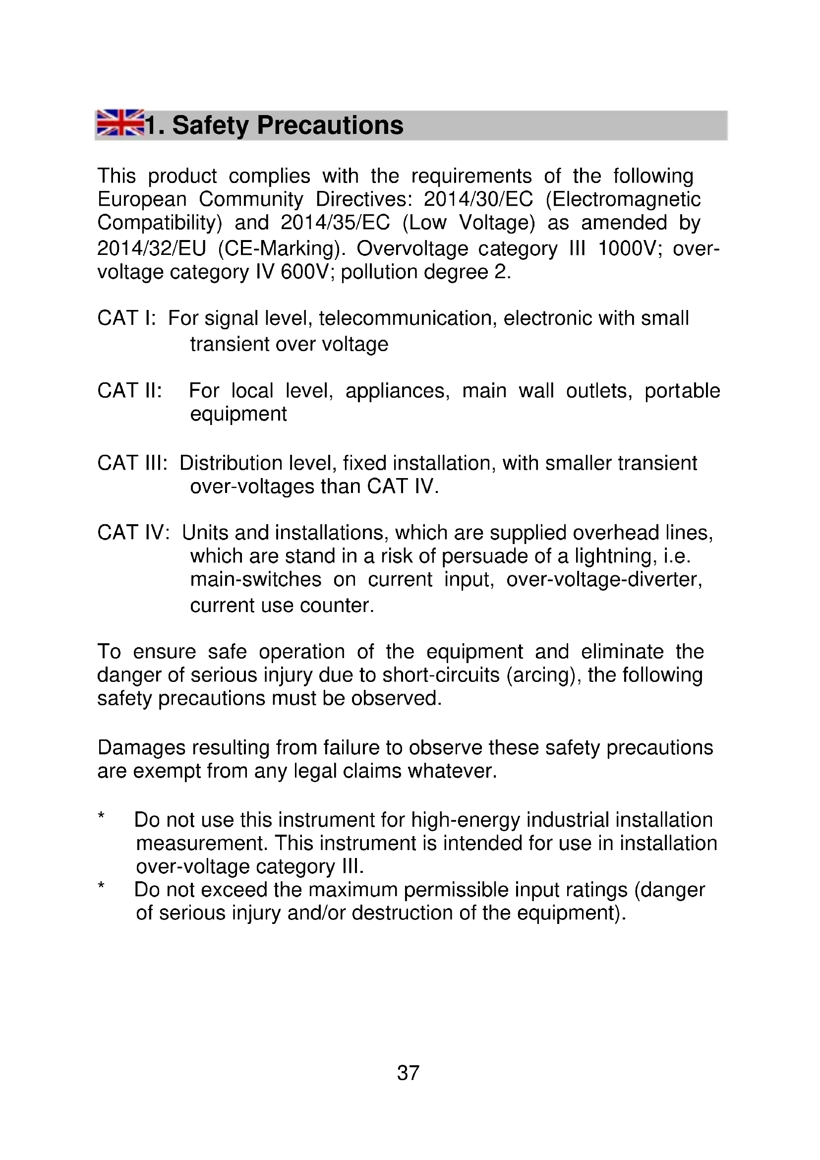 This product complies with the requirements of the following European Community Directives: 2014/30/EC (Electromagnetic Compatibility) and 2014/35/EC (Low Voltage) as amended by 2014/32/EU (CE-Marking). Overvoltage category III 1000V; over- voltage category IV 600V; pollution degree 2. CAT I: For signal level, telecommunication, electronic with small transient over voltage CAT II: For local level, appliances, main wall outlets, portable equipment CAT III: Distribution level, fixed installation, with smaller transient over-voltages than CAT IV. CAT IV: Units and installations, which are supplied overhead lines, which are stand in a risk of persuade of a lightning, i.e. main-switches on current input, over-voltage-diverter, current use counter. To ensure safe operation of the equipment and eliminate the danger of serious injury due to short-circuits (arcing), the following safety precautions must be observed. Damages resulting from failure to observe these safety precautions are exempt from any legal claims whatever.